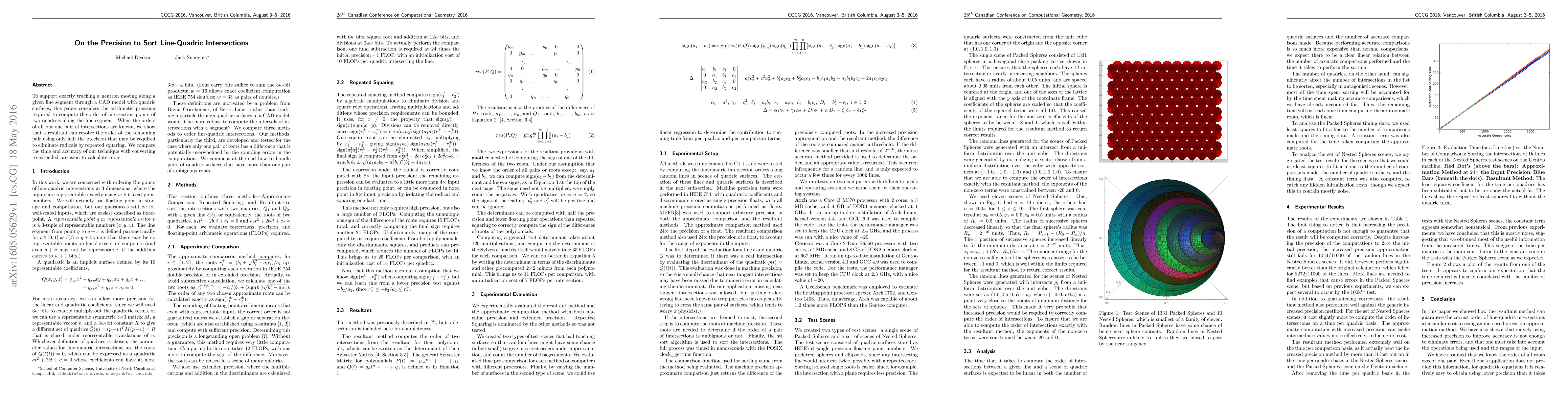 To support exactly tracking a neutron moving along a given line segment through a CAD model with quadric surfaces, this paper considers the arithmetic precision required to compute the order of intersection points of two quadrics along the line segment. When the orders of all but one pair of intersections are known, we show that a resultant can resolve the order of the remaining pair using only half the precision that may be required to eliminate radicals by repeated squaring. We compare the time and accuracy of our technique with converting to extended precision to calculate roots.