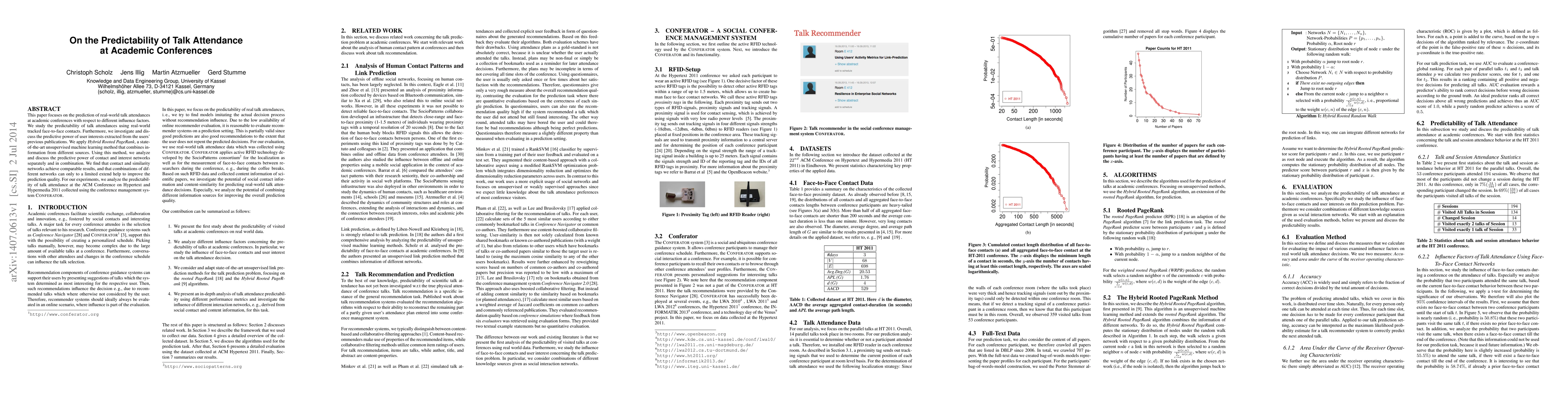 Researchers studied how well they can predict attendance at academic conferences using face-to-face contacts and user interests from past publications. They found that combining contact and interest networks improved prediction quality only slightly.