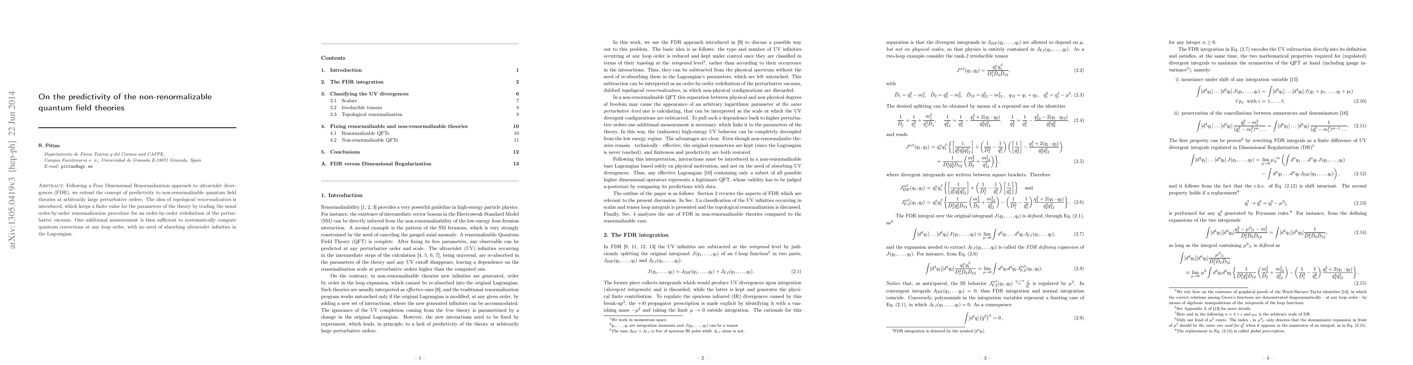 Following a Four Dimensional Renormalization approach to ultraviolet divergences (FDR), we extend the concept of predictivity to non-renormalizable quantum field theories at arbitrarily large perturbative orders. The idea of topological renormalization is introduced, which keeps a finite value for the parameters of the theory by trading the usual order-by-order renormalization procedure for an order-by-order redefinition of the perturbative vacuum. One additional measurement is then sufficient to systematically compute quantum corrections at any loop order, with no need of absorbing ultraviolet infinities in the Lagrangian.
