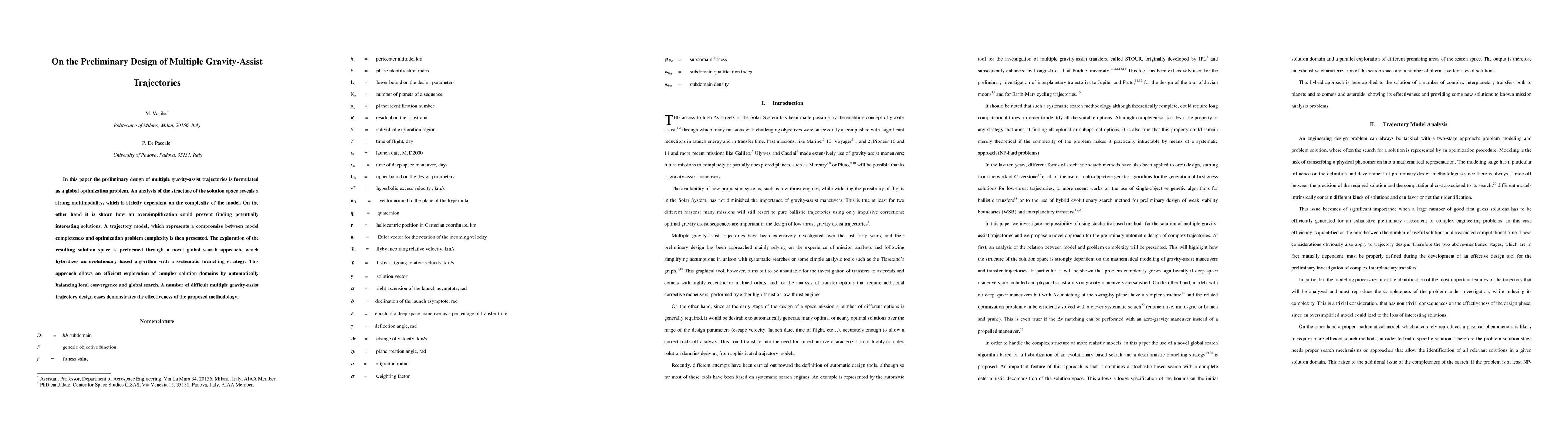 This paper formulates the preliminary design of multiple gravity-assist trajectories as a global optimization problem, addressing the multimodality of the solution space through a hybrid search approach combining evolutionary algorithms with systematic branching. The proposed methodology effectively balances local convergence and global search, demonstrating its effectiveness in complex trajectory design cases.