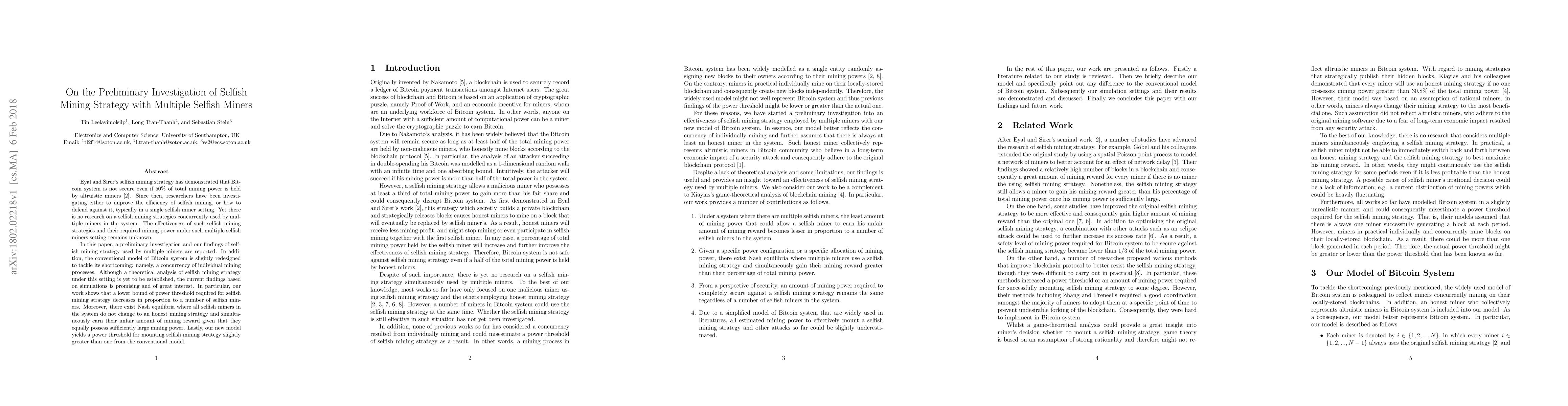 This paper investigates the preliminary effectiveness of selfish mining strategies employed by multiple miners in Bitcoin, revealing that the required mining power threshold decreases with more selfish miners. It also proposes a modified Bitcoin model addressing concurrency issues, showing promising simulation results and the existence of Nash equilibria where multiple selfish miners can collectively benefit.