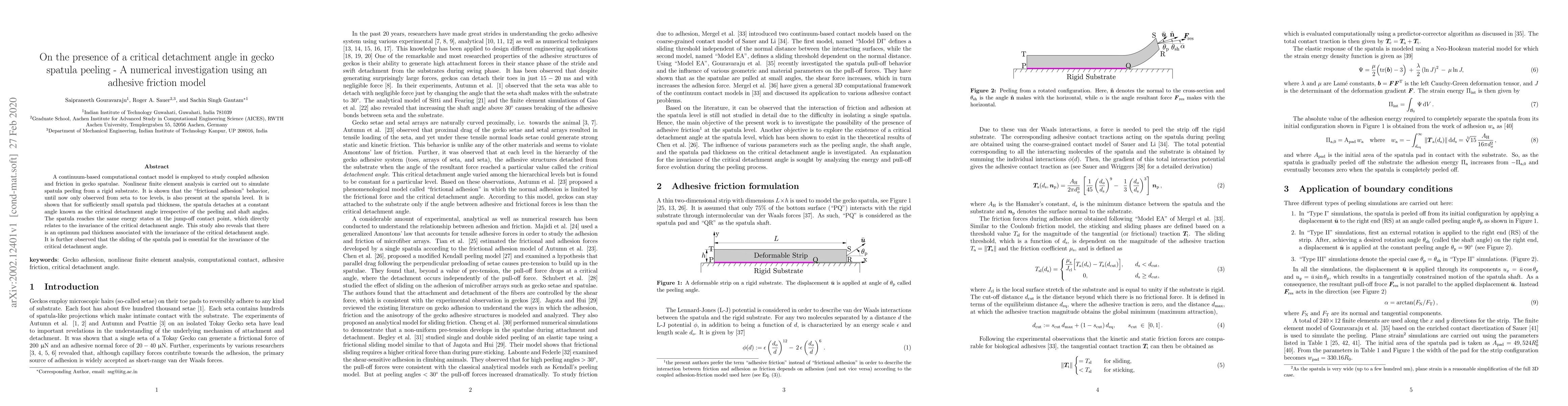 A continuum-based computational contact model is employed to study coupled adhesion and friction in gecko spatulae. Nonlinear finite element analysis is carried out to simulate spatula peeling from a rigid substrate. It is shown that the "frictional adhesion" behavior, until now only observed from seta to toe levels, is also present at the spatula level. It is shown that for sufficiently small spatula pad thickness, the spatula detaches at a constant angle known as the critical detachment angle irrespective of the peeling and shaft angles. The spatula reaches the same energy states at the jump-off contact point, which directly relates to the invariance of the critical detachment angle. This study also reveals that there is an optimum pad thickness associated with the invariance of the critical detachment angle. It is further observed that the sliding of the spatula pad is essential for the invariance of the critical detachment angle.