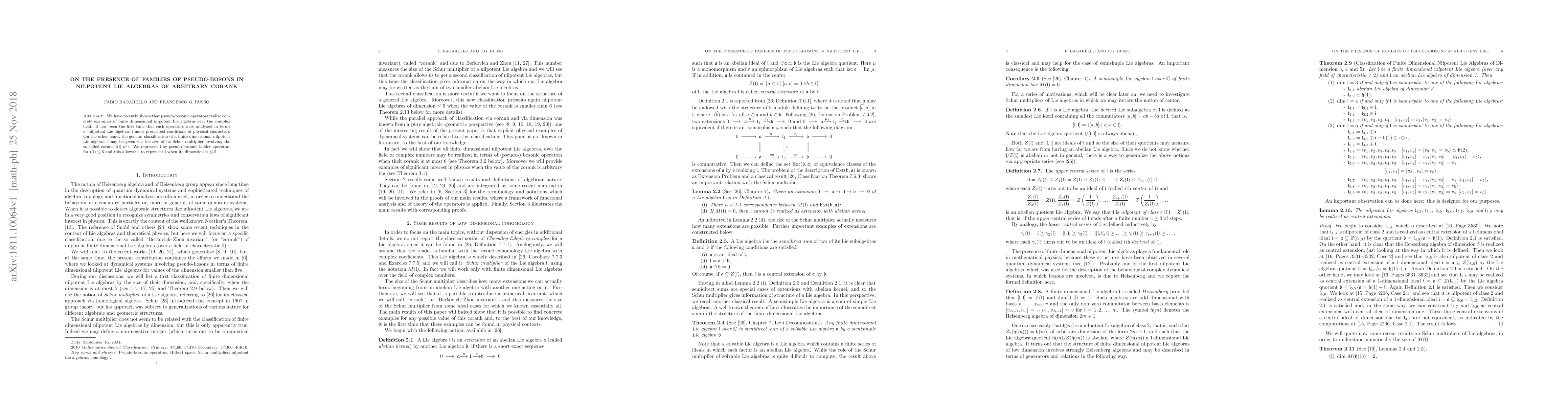 We have recently shown that pseudo-bosonic operators realize concrete examples of finite dimensional nilpotent Lie algebras over the complex field. It has been the first time that such operators were analyzed in terms of nilpotent Lie algebras (under prescribed conditions of physical character). On the other hand, the general classification of a finite dimensional nilpotent Lie algebra $\mathfrak{l}$ may be given via the size of its Schur multiplier involving the so-called corank $t(\mathfrak{l})$ of $\mathfrak{l}$. We represent $\mathfrak{l}$ by pseudo-bosonic ladder operators for $t(\mathfrak{l}) \le 6$ and this allows us to represent $\mathfrak{l}$ when its dimension is $\le 5$.