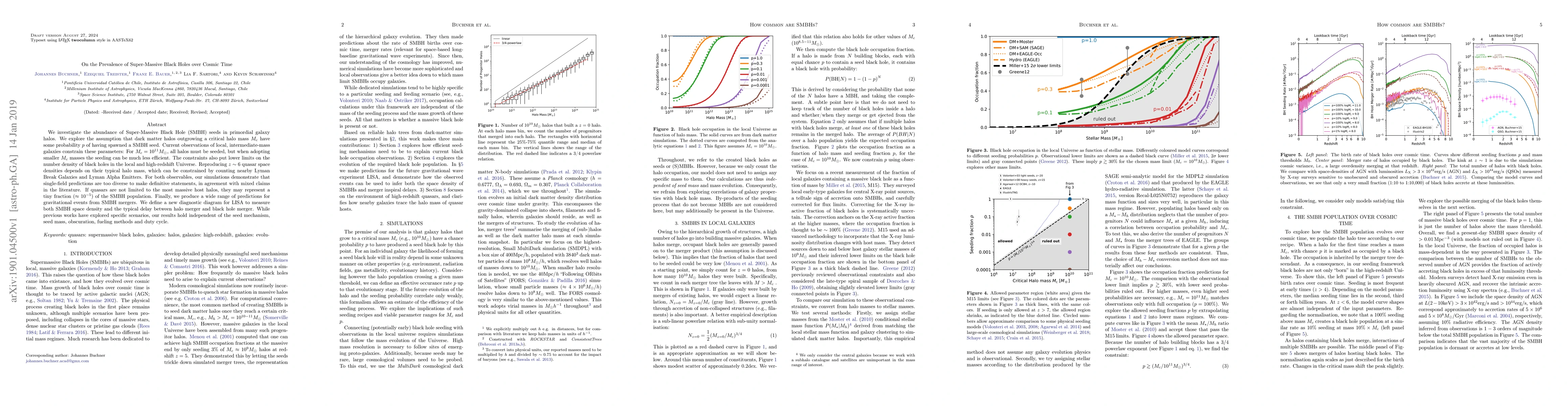 We investigate the abundance of Super-Massive Black Hole (SMBH) seeds in primordial galaxy halos. We explore the assumption that dark matter halos outgrowing a critical halo mass M_c have some probability p of having spawned a SMBH seed. Current observations of local, intermediate-mass galaxies constrain these parameters: For $M_c=10^{11}M_\odot$, all halos must be seeded, but when adopting smaller M_c masses the seeding can be much less efficient. The constraints also put lower limits on the number density of black holes in the local and high-redshift Universe. Reproducing z~6 quasar space densities depends on their typical halo mass, which can be constrained by counting nearby Lyman Break Galaxies and Lyman Alpha Emitters. For both observables, our simulations demonstrate that single-field predictions are too diverse to make definitive statements, in agreement with mixed claims in the literature. If quasars are not limited to the most massive host halos, they may represent a tiny fraction (~10^-5) of the SMBH population. Finally, we produce a wide range of predictions for gravitational events from SMBH mergers. We define a new diagnostic diagram for LISA to measure both SMBH space density and the typical delay between halo merger and black hole merger. While previous works have explored specific scenarios, our results hold independent of the seed mechanism, seed mass, obscuration, fueling methods and duty cycle.