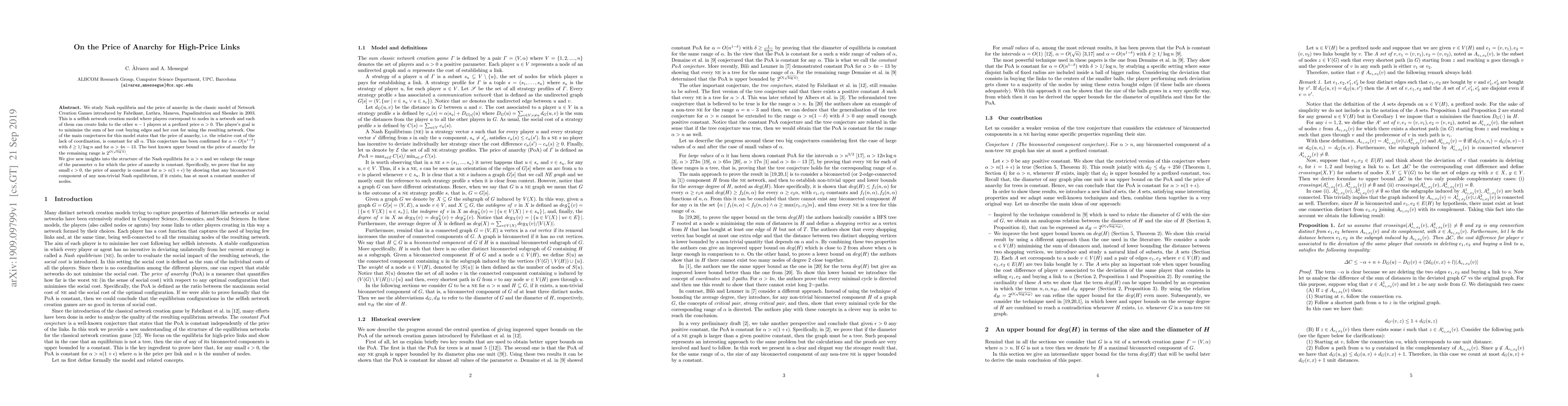 This paper explores Nash equilibria and the price of anarchy in Network Creation Games, particularly focusing on high-price links ($\alpha > n$). It extends the range where the price of anarchy is constant, proving that for $\alpha > n(1+\epsilon)$, the price of anarchy remains constant by demonstrating that any biconnected component in non-trivial Nash equilibria has a limited size.