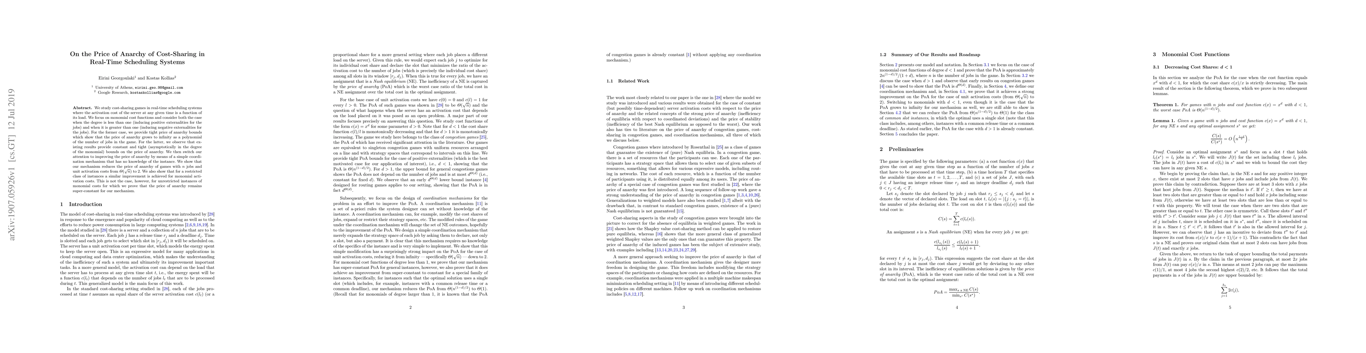 We study cost-sharing games in real-time scheduling systems where the activation cost of the server at any given time is a function of its load. We focus on monomial cost functions and consider both the case when the degree is less than one (inducing positive externalities for the jobs) and when it is greater than one (inducing negative externalities for the jobs). For the former case, we provide tight price of anarchy bounds which show that the price of anarchy grows to infinity as a polynomial of the number of jobs in the game. For the latter, we observe that existing results provide constant and tight (asymptotically in the degree of the monomial) bounds on the price of anarchy. We then switch our attention to improving the price of anarchy by means of a simple coordination mechanism that has no knowledge of the instance. We show that our mechanism reduces the price of anarchy of games with $n$ jobs and unit activation costs from $\Theta(\sqrt{n})$ to $2$. We also show that for a restricted class of instances a similar improvement is achieved for monomial activation costs. This is not the case, however, for unrestricted instances of monomial costs for which we prove that the price of anarchy remains super-constant for our mechanism.