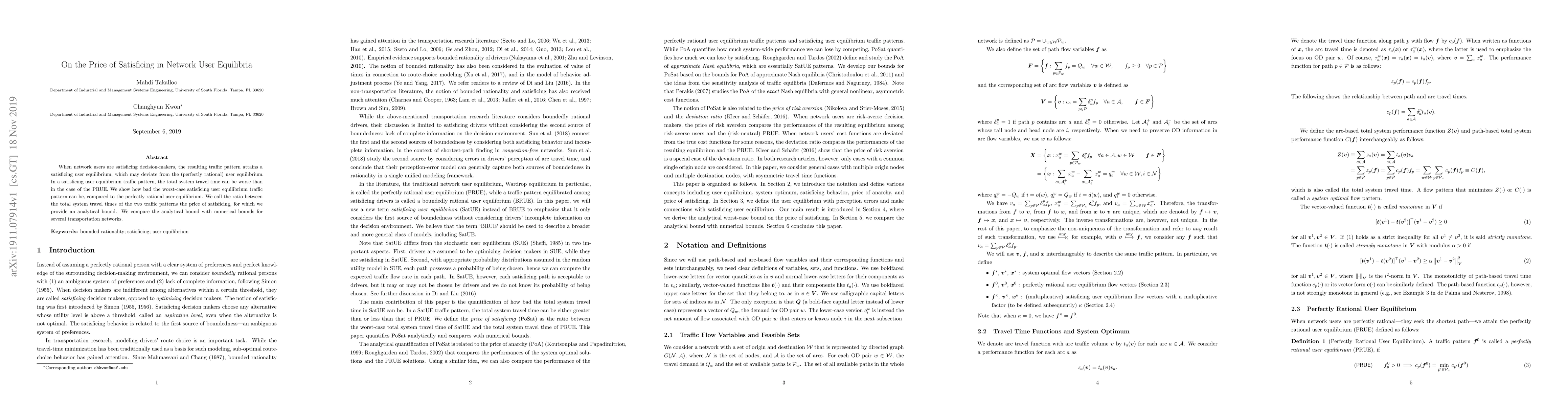 This paper explores the impact of satisficing behavior on network traffic patterns, showing that the resulting satisficing user equilibrium can lead to worse total system travel times compared to the perfectly rational user equilibrium. It introduces the "price of satisficing" as the ratio of these travel times and provides an analytical bound for it, comparing it with numerical bounds across various transportation networks.