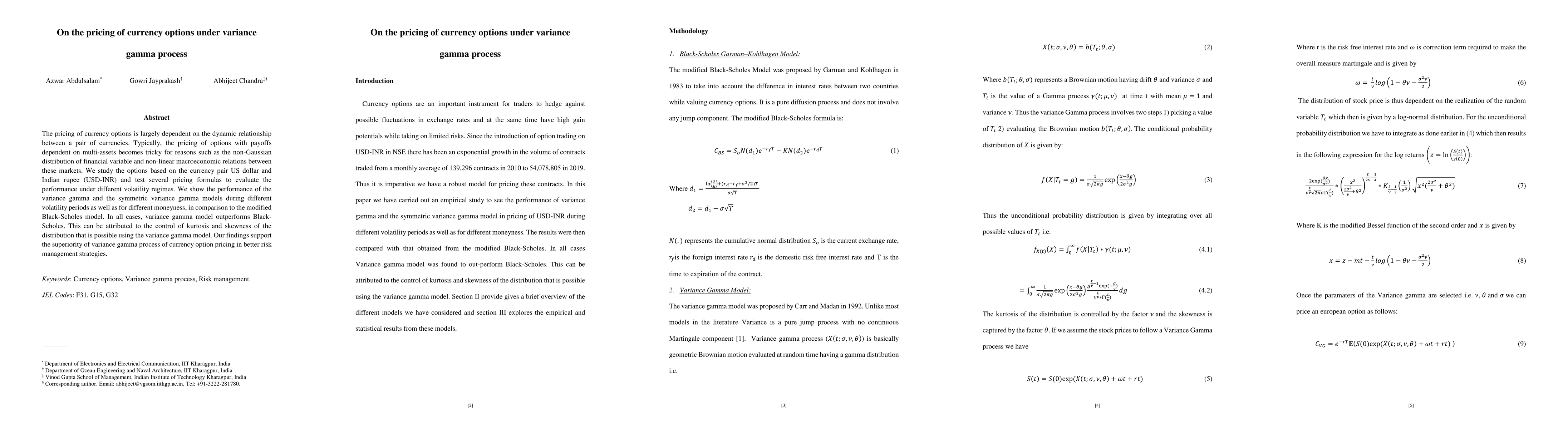 This study finds that variance gamma models outperform modified Black-Scholes for pricing currency options, especially in controlling kurtosis and skewness of the distribution.