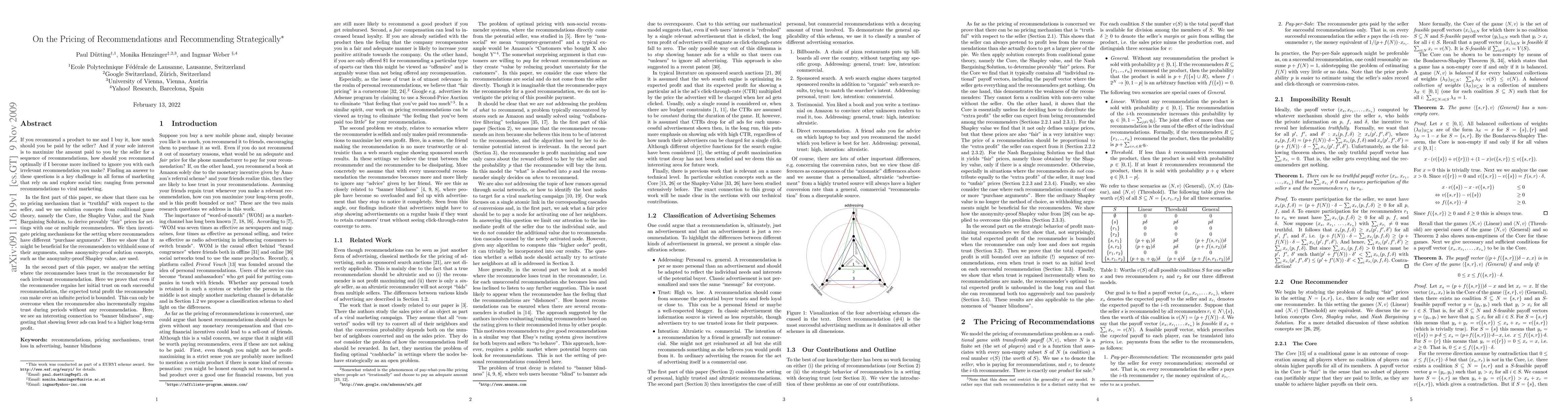 If you recommend a product to me and I buy it, how much should you be paid by the seller? And if your sole interest is to maximize the amount paid to you by the seller for a sequence of recommendations, how should you recommend optimally if I become more inclined to ignore you with each irrelevant recommendation you make? Finding an answer to these questions is a key challenge in all forms of marketing that rely on and explore social ties; ranging from personal recommendations to viral marketing. In the first part of this paper, we show that there can be no pricing mechanism that is "truthful" with respect to the seller, and we use solution concepts from coalitional game theory, namely the Core, the Shapley Value, and the Nash Bargaining Solution, to derive provably "fair" prices for settings with one or multiple recommenders. We then investigate pricing mechanisms for the setting where recommenders have different "purchase arguments". Here we show that it might be beneficial for the recommenders to withhold some of their arguments, unless anonymity-proof solution concepts, such as the anonymity-proof Shapley value, are used. In the second part of this paper, we analyze the setting where the recommendee loses trust in the recommender for each irrelevant recommendation. Here we prove that even if the recommendee regains her initial trust on each successful recommendation, the expected total profit the recommender can make over an infinite period is bounded. This can only be overcome when the recommendee also incrementally regains trust during periods without any recommendation. Here, we see an interesting connection to "banner blindness", suggesting that showing fewer ads can lead to a higher long-term profit.