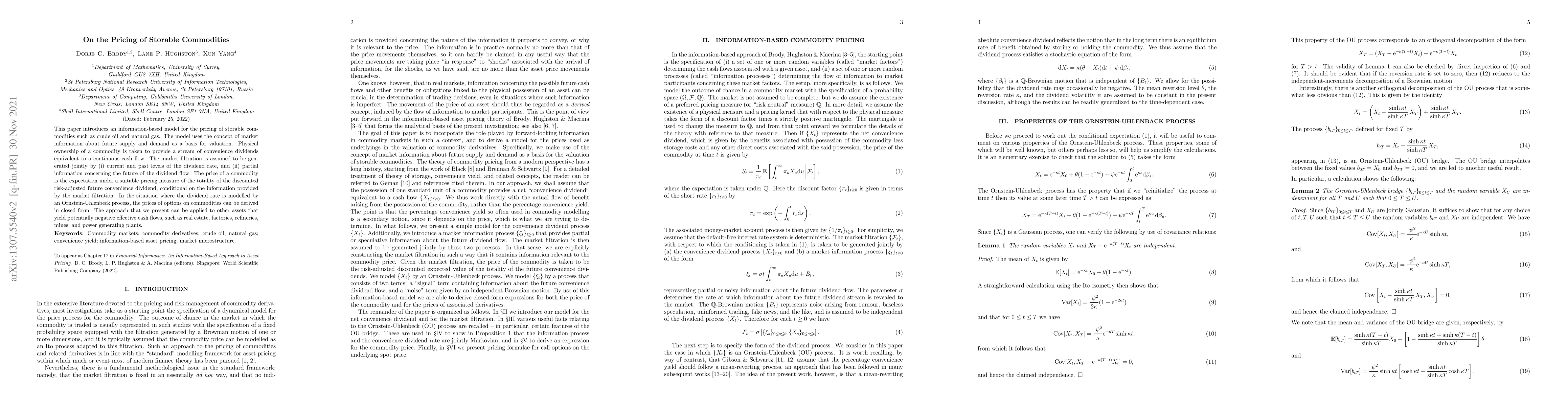 This paper introduces an information-based model for the pricing of storable commodities such as crude oil and natural gas. The model uses the concept of market information about future supply and demand as a basis for valuation. Physical ownership of a commodity is taken to provide a stream of convenience dividends equivalent to a continuous cash flow. The market filtration is assumed to be generated jointly by (i) current and past levels of the dividend rate, and (ii) partial information concerning the future of the dividend flow. The price of a commodity is the expectation under a suitable pricing measure of the totality of the discounted risk-adjusted future convenience dividend, conditional on the information provided by the market filtration. In the situation where the dividend rate is modelled by an Ornstein-Uhlenbeck process, the prices of options on commodities can be derived in closed form. The approach that we present can be applied to other assets that yield potentially negative effective cash flows, such as real estate, factories, refineries, mines, and power generating plants.