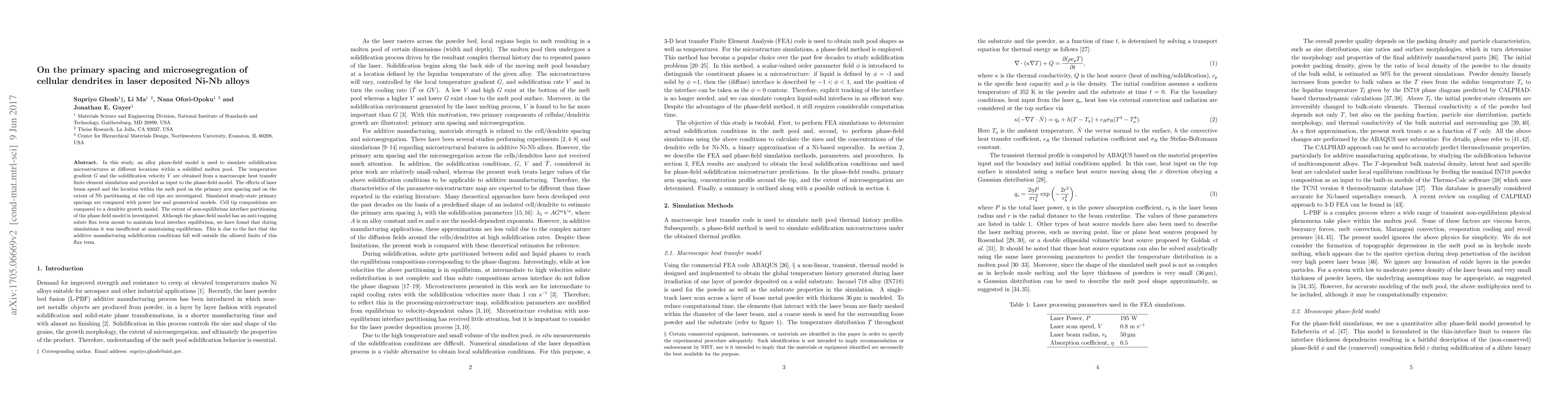 This study uses an alloy phase-field model to simulate solidification microstructures in laser deposited Ni-Nb alloys, analyzing the effects of laser speed and melt pool location on primary arm spacing and Nb partitioning. Despite the model's anti-trapping solute flux term, it fails to maintain equilibrium due to extreme solidification conditions.