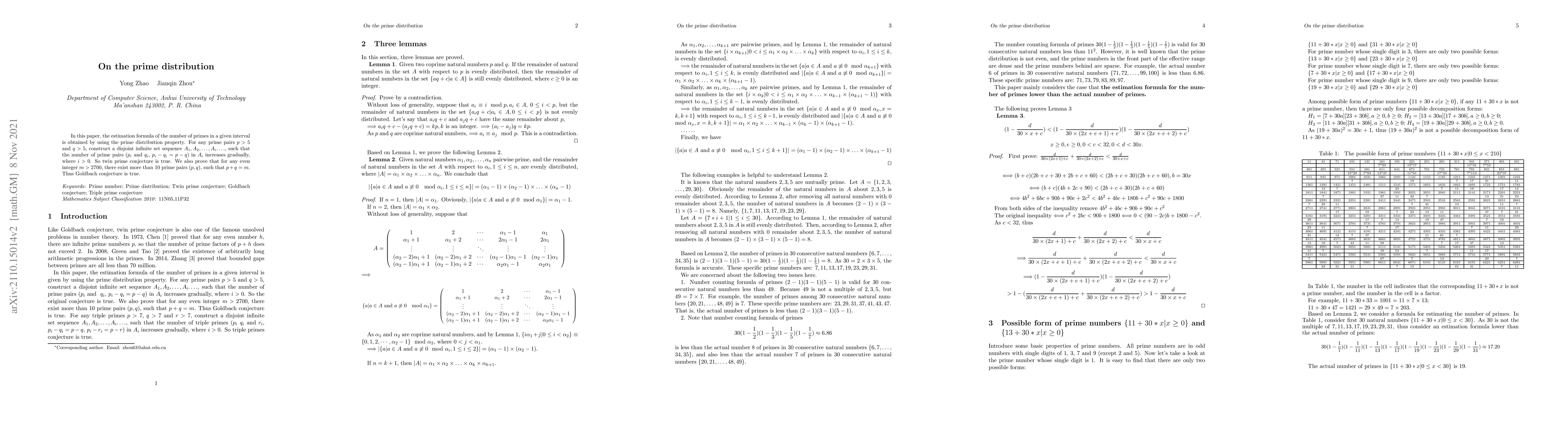 In this paper, the estimation formula of the number of primes in a given interval is obtained by using the prime distribution property. For any prime pairs $p>5$ and $ q>5 $, construct a disjoint infinite set sequence $A_1, A_2, \ldots, A_i. \ldots $, such that the number of prime pairs ($p_i$ and $q_i $, $p_i-q_i = p-q $) in $A_i $ increases gradually, where $i>0$. So twin prime conjecture is true. We also prove that for any even integer $m>2700$, there exist more than 10 prime pairs $(p,q)$, such that $p+q=m$. Thus Goldbach conjecture is true.
