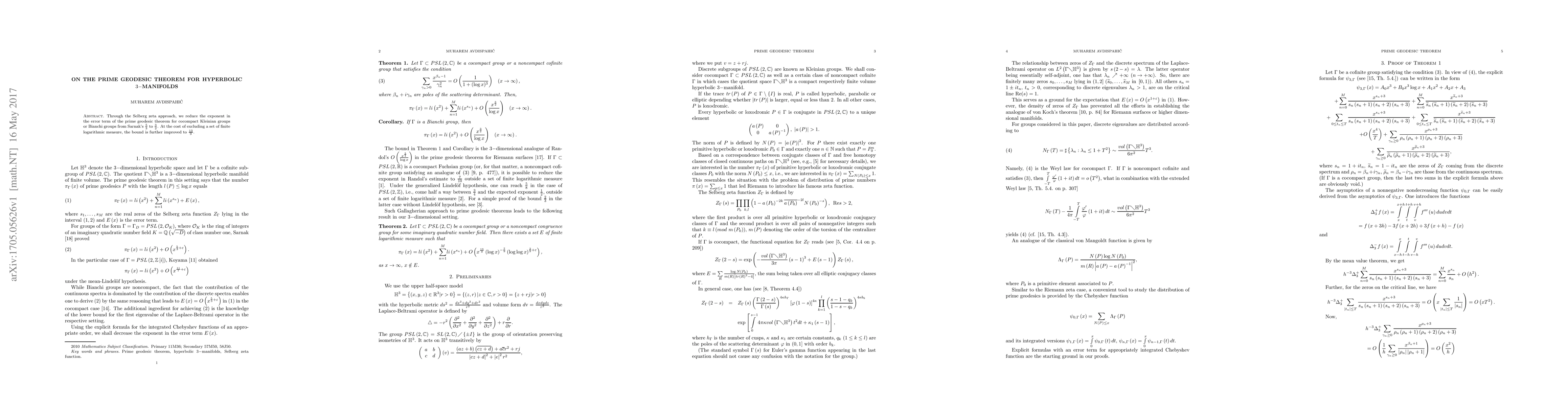 This paper improves the prime geodesic theorem's error term for hyperbolic 3-manifolds using the Selberg zeta approach, reducing the exponent from Sarnak's $\frac{5}{3}$ to $\frac{3}{2}$, and further to $\frac{13}{9}$ while excluding a set of finite logarithmic measure.