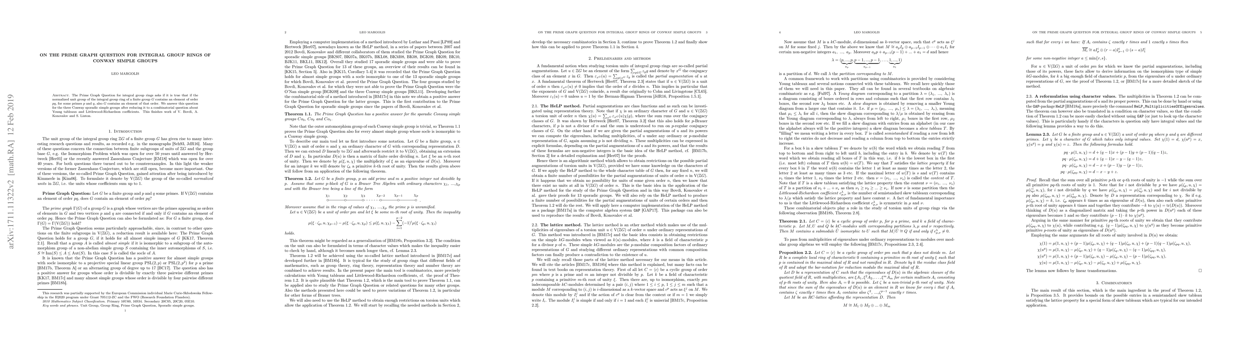 The Prime Graph Question for integral group rings investigates whether elements of order $pq$ in the normalized unit group imply such elements in the group itself. For the Conway sporadic simple groups, this question is answered affirmatively by reducing it to combinatorial analysis involving Young tableaus and Littlewood-Richardson coefficients.