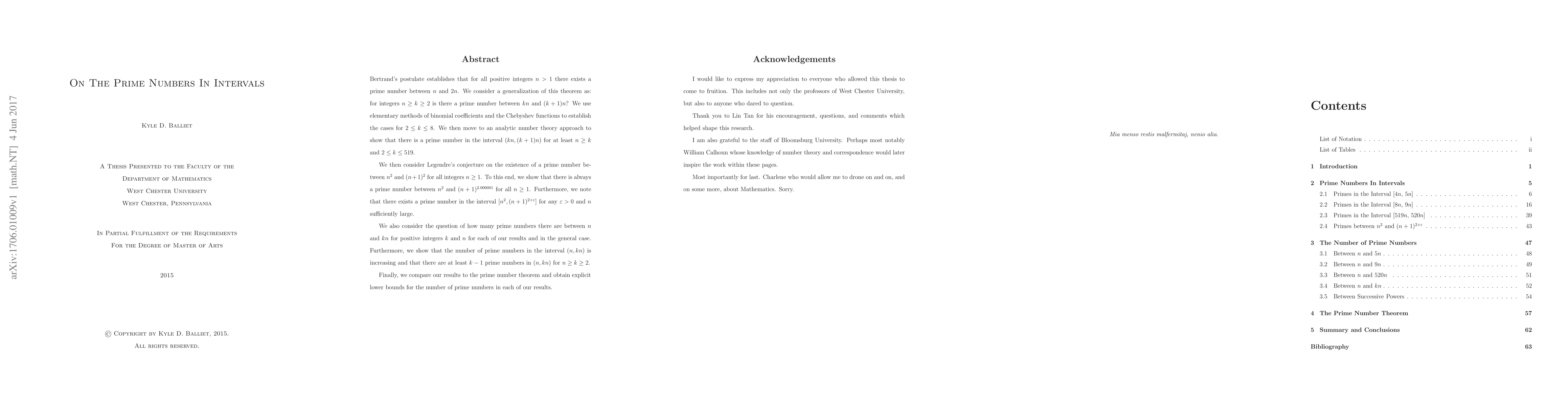 Bertrand's postulate establishes that for all positive integers $n>1$ there exists a prime number between $n$ and $2n$. We consider a generalization of this theorem as: for integers $n\geq k\geq 2$ is there a prime number between $kn$ and $(k+1)n$? We use elementary methods of binomial coefficients and the Chebyshev functions to establish the cases for $2\leq k\leq 8$. We then move to an analytic number theory approach to show that there is a prime number in the interval $(kn, (k+1)n)$ for at least $n\geq k$ and $2\leq k\leq 519$. We then consider Legendre's conjecture on the existence of a prime number between $n^2$ and $ (n+1)^2$ for all integers $n\geq 1$. To this end, we show that there is always a prime number between $n^2$ and $(n+1)^{2.000001}$ for all $n\geq 1$. Furthermore, we note that there exists a prime number in the interval $[n^2,(n+1)^{2+\varepsilon}]$ for any $\varepsilon>0$ and $n$ sufficiently large. We also consider the question of how many prime numbers there are between $n$ and $kn$ for positive integers $k$ and $n$ for each of our results and in the general case. Furthermore, we show that the number of prime numbers in the interval $(n,kn)$ is increasing and that there are at least $k-1$ prime numbers in $(n,kn)$ for $n\geq k\geq 2$. Finally, we compare our results to the prime number theorem and obtain explicit lower bounds for the number of prime numbers in each of our results.