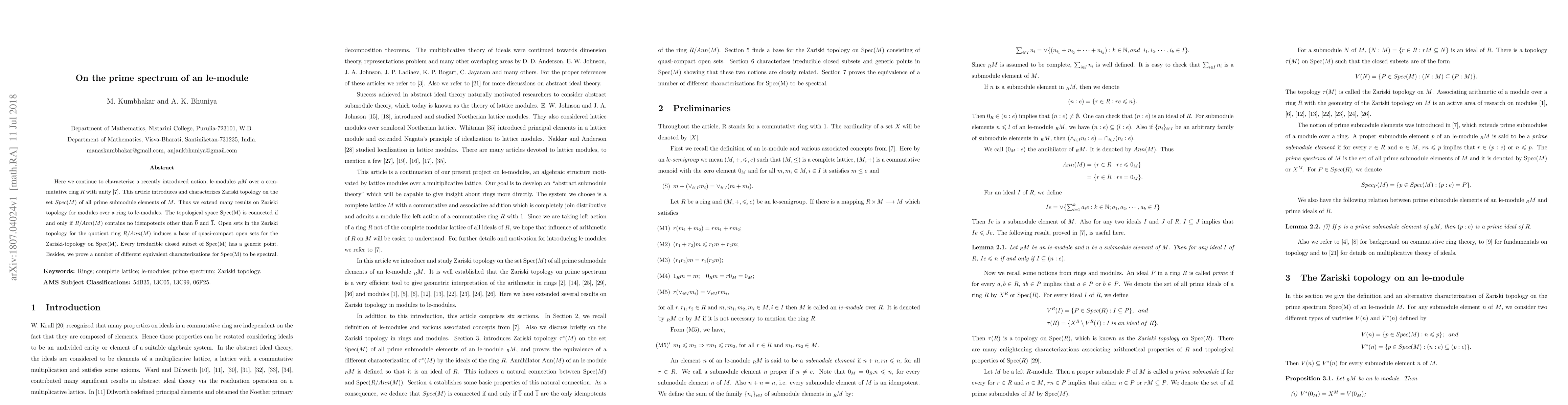 Here we continue to characterize a recently introduced notion, le-modules $_{R}M$ over a commutative ring $R$ with unity \cite{Bhuniya}. This article introduces and characterizes Zariski topology on the set $Spec(M)$ of all prime submodule elements of $M$. Thus we extend many results on Zariski topology for modules over a ring to le-modules. The topological space Spec(M) is connected if and only if $R/Ann(M)$ contains no idempotents other than $\overline{0}$ and $\overline{1}$. Open sets in the Zariski topology for the quotient ring $R/Ann(M)$ induces a base of quasi-compact open sets for the Zariski-topology on Spec(M). Every irreducible closed subset of Spec(M) has a generic point. Besides, we prove a number of different equivalent characterizations for Spec(M) to be spectral.
