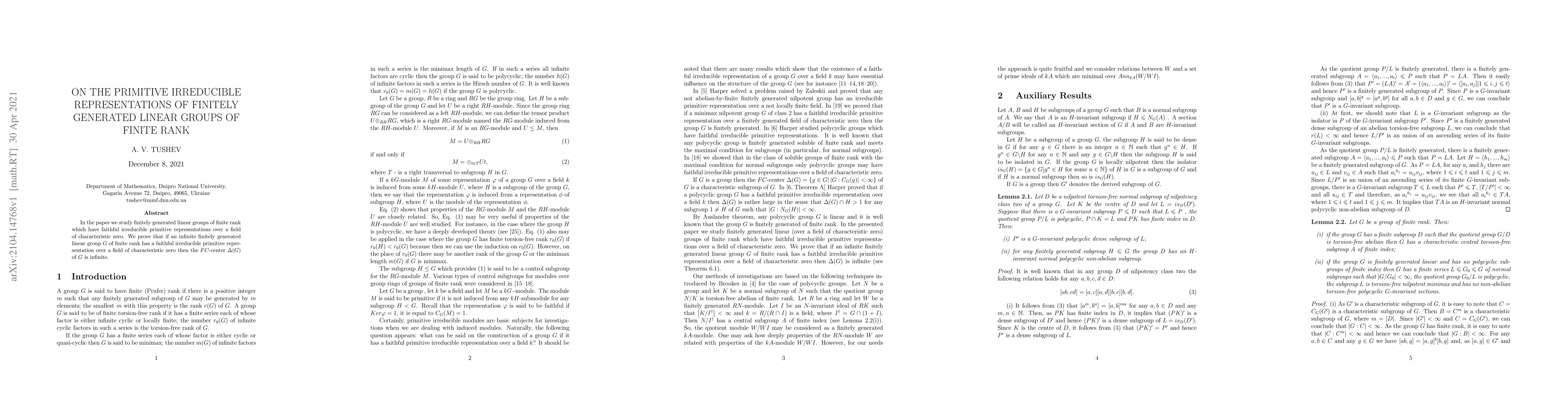 Summary: This research examines the faithful irreducible primitive representations of infinite finitely generated linear groups of finite rank over fields of characteristic zero, proving that such groups must have an infinite $FC$-center.