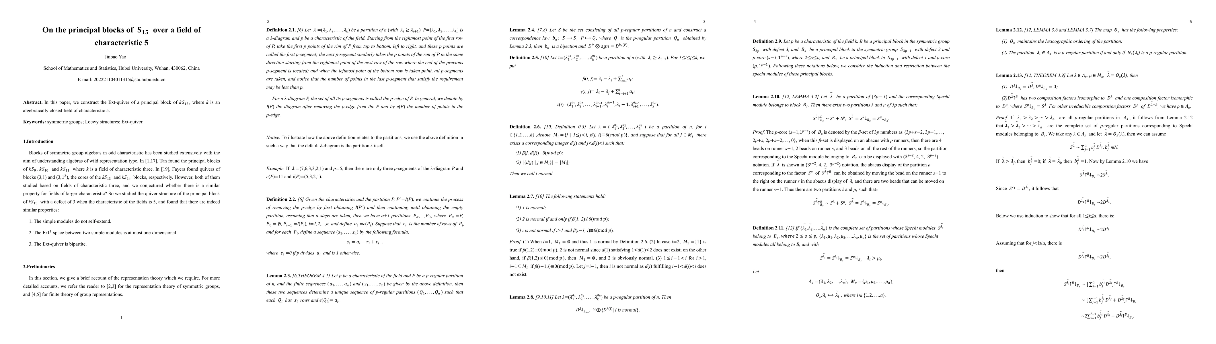 Summary: This research constructs the Ext-quiver for a principal block in the group algebra $kS_{15}$ over a field of characteristic 5, elucidating the structure and relationships within the block.