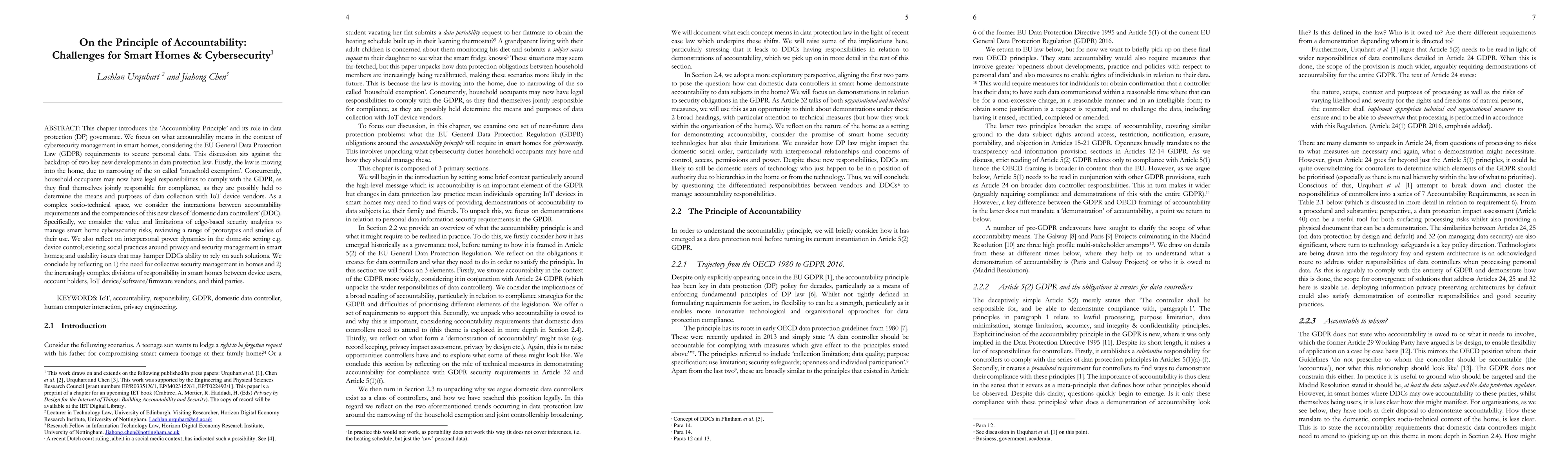 This paper explores the Accountability Principle in smart home cybersecurity, emphasizing the evolving legal responsibilities of household occupants under GDPR. It examines the challenges of managing cybersecurity risks through edge-based security analytics and the complexities of interpersonal dynamics and usability issues in smart home environments.
