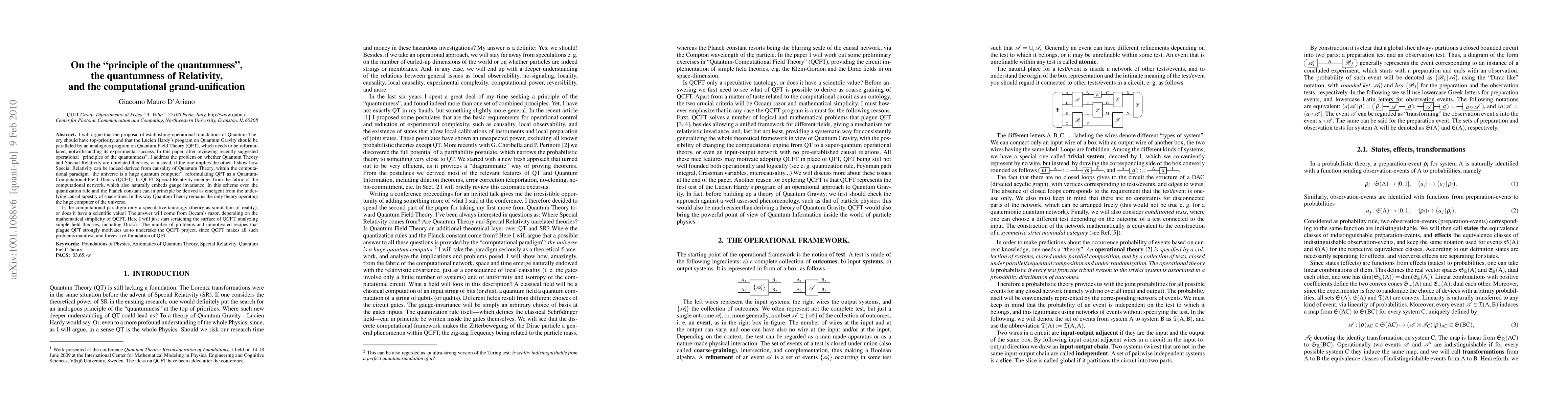 After reviewing recently suggested operational "principles of the quantumness", I address the problem on whether Quantum Theory (QT) and Special Relativity (SR) are unrelated theories, or instead, if the one implies the other. I show how SR can be indeed derived from causality of QT, within the computational paradigm "the universe is a huge quantum computer", reformulating QFT as a Quantum-Computational Field Theory (QCFT). In QCFT SR emerges from the fabric of the computational network, which also naturally embeds gauge invariance. In this scheme even the quantization rule and the Planck constant can in principle be derived as emergent from the underlying causal tapestry of space-time. In this way QT remains the only theory operating the huge computer of the universe. Is QCFT only a speculative tautology (theory as simulation of reality), or does it have a scientific value? The answer will come from Occam's razor, depending on the mathematical simplicity of QCFT. Here I will just start scratching the surface of QCFT, analyzing simple field theories, including Dirac's. The number of problems and unmotivated recipes that plague QFT strongly motivates us to undertake the QCFT project, since QCFT makes all such problems manifest, and forces a re-foundation of QFT.