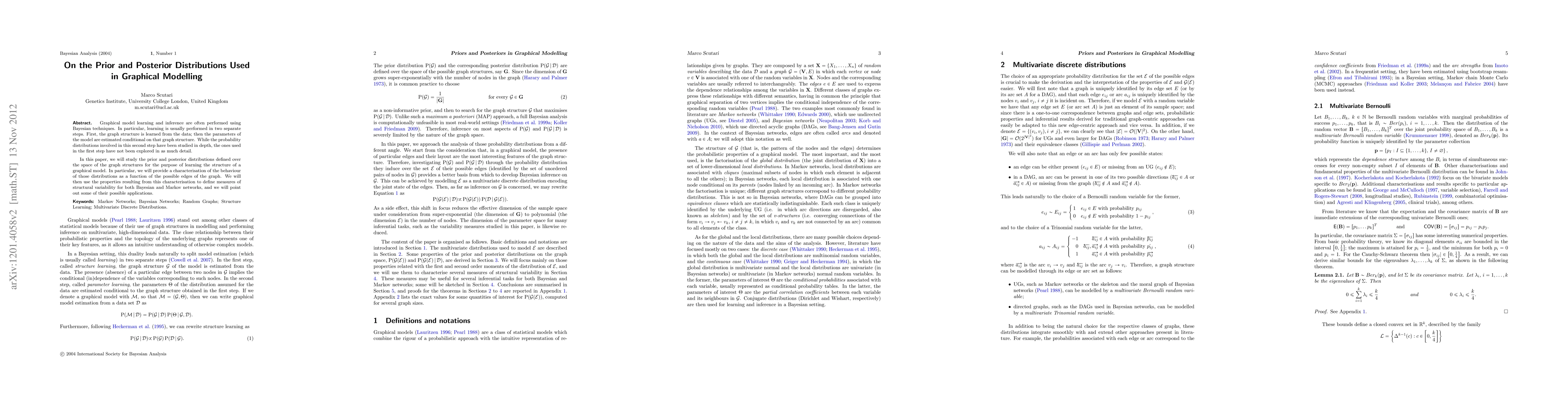 Graphical model learning and inference are often performed using Bayesian techniques. In particular, learning is usually performed in two separate steps. First, the graph structure is learned from the data; then the parameters of the model are estimated conditional on that graph structure. While the probability distributions involved in this second step have been studied in depth, the ones used in the first step have not been explored in as much detail. In this paper, we will study the prior and posterior distributions defined over the space of the graph structures for the purpose of learning the structure of a graphical model. In particular, we will provide a characterisation of the behaviour of those distributions as a function of the possible edges of the graph. We will then use the properties resulting from this characterisation to define measures of structural variability for both Bayesian and Markov networks, and we will point out some of their possible applications.