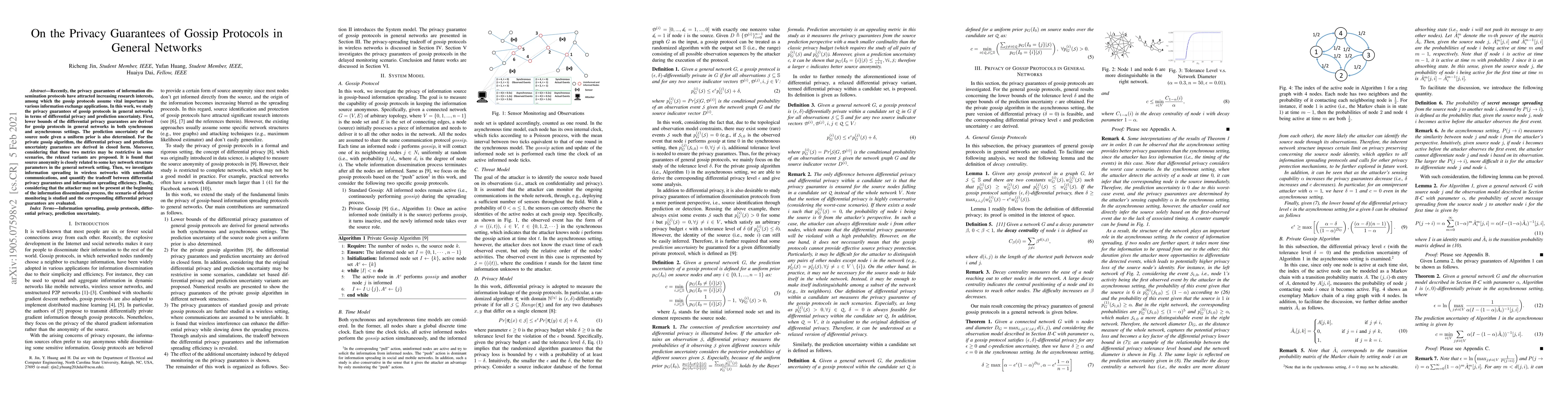 Recently, the privacy guarantees of information dissemination protocols have attracted increasing research interests, among which the gossip protocols assume vital importance in various information exchange applications. In this work, we study the privacy guarantees of gossip protocols in general networks in terms of differential privacy and prediction uncertainty. First, lower bounds of the differential privacy guarantees are derived for gossip protocols in general networks in both synchronous and asynchronous settings. The prediction uncertainty of the source node given a uniform prior is also determined. For the private gossip algorithm, the differential privacy and prediction uncertainty guarantees are derived in closed form. Moreover, considering that these two metrics may be restrictive in some scenarios, the relaxed variants are proposed. It is found that source anonymity is closely related to some key network structure parameters in the general network setting. Then, we investigate information spreading in wireless networks with unreliable communications, and quantify the tradeoff between differential privacy guarantees and information spreading efficiency. Finally, considering that the attacker may not be present at the beginning of the information dissemination process, the scenario of delayed monitoring is studied and the corresponding differential privacy guarantees are evaluated.
