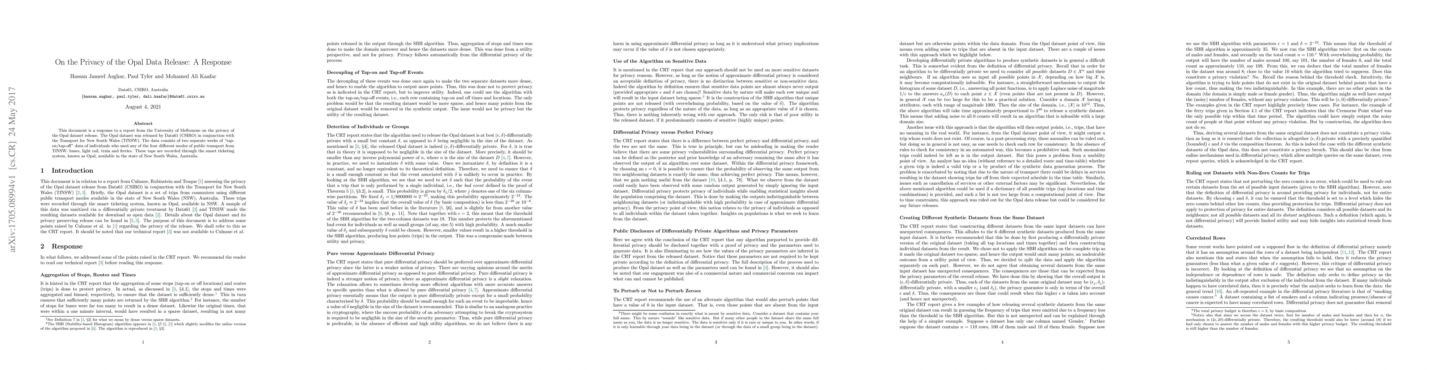 This document is a response to a report from the University of Melbourne on the privacy of the Opal dataset release. The Opal dataset was released by Data61 (CSIRO) in conjunction with the Transport for New South Wales (TfNSW). The data consists of two separate weeks of "tap-on/tap-off" data of individuals who used any of the four different modes of public transport from TfNSW: buses, light rail, train and ferries. These taps are recorded through the smart ticketing system, known as Opal, available in the state of New South Wales, Australia.