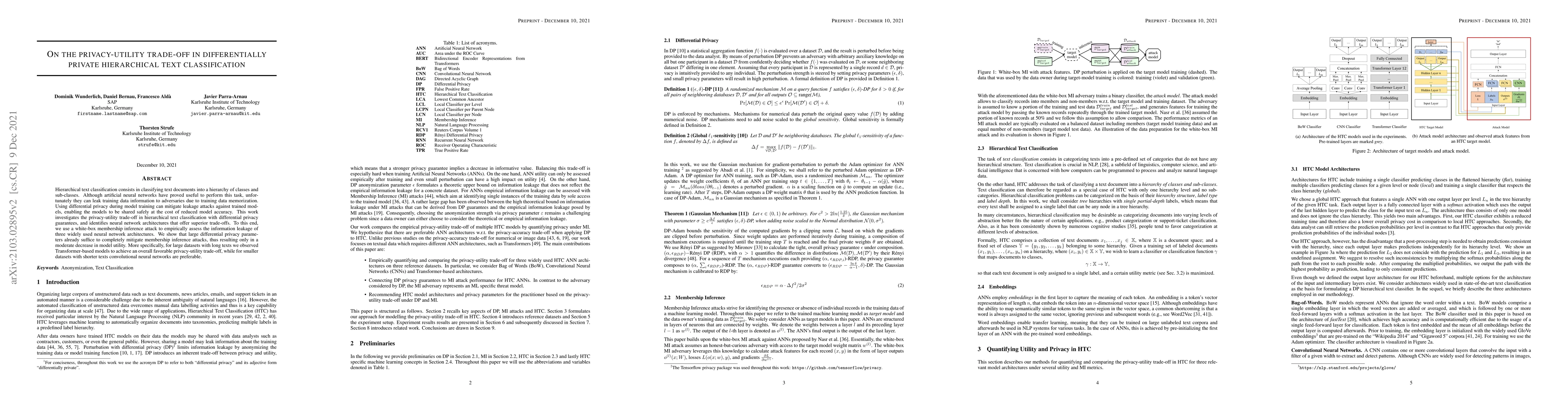 This paper examines the privacy-utility trade-off in differentially private hierarchical text classification, focusing on the effectiveness of different neural network architectures against membership inference attacks. It finds that Transformer-based models provide a better balance for large datasets, while convolutional neural networks work better for smaller datasets.
