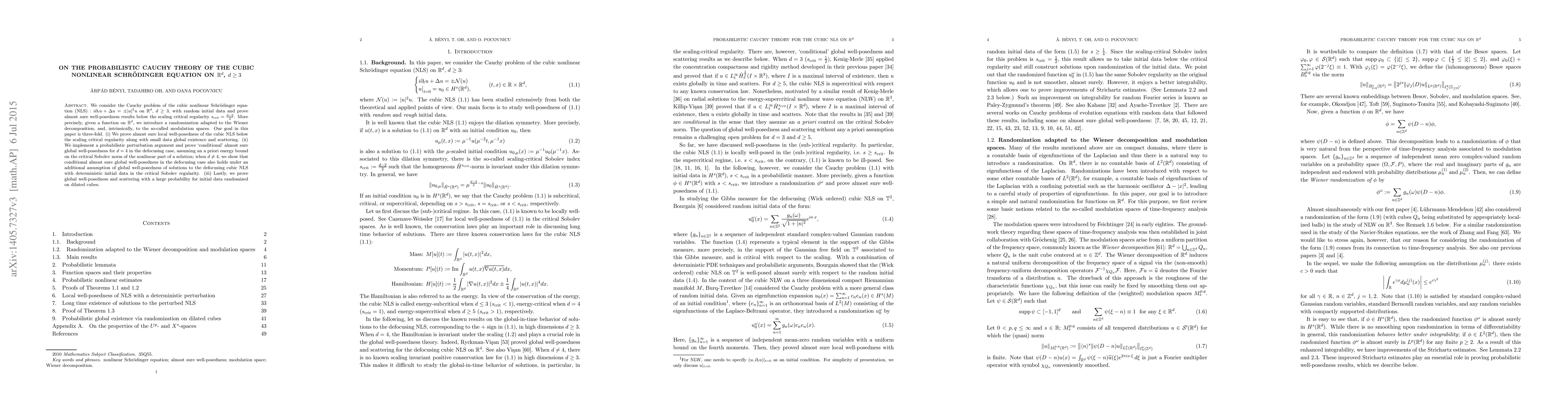 This paper investigates the probabilistic Cauchy theory for the cubic nonlinear Schrödinger equation on $\mathbb R^d$ ($d \geq 3$) with random initial data, proving almost sure local well-posedness below critical regularity and conditional global well-posedness under specific assumptions. It also demonstrates global well-posedness and scattering with high probability for randomized initial data.