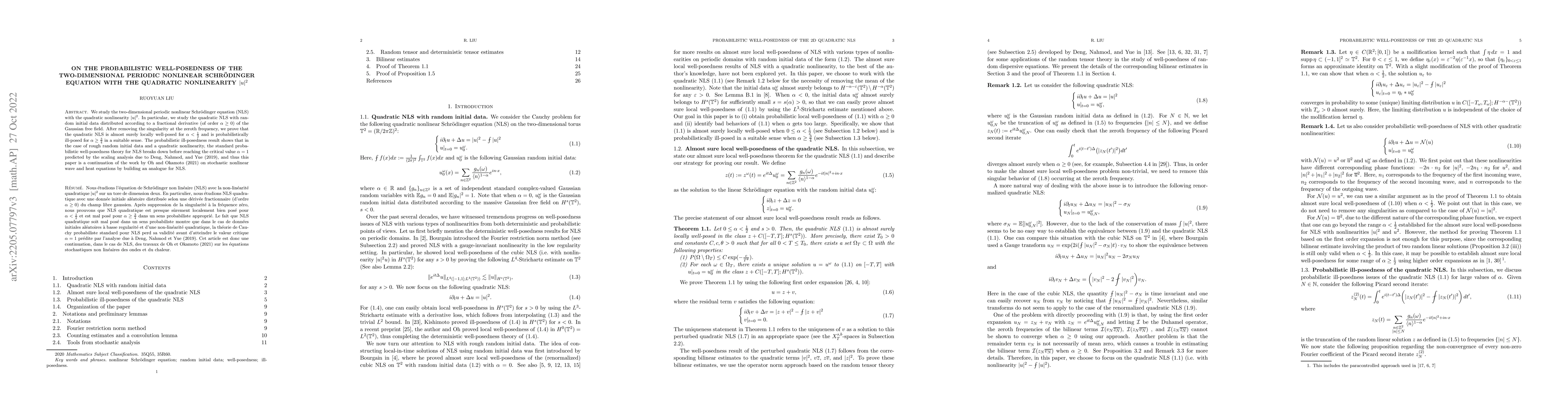 We study the two-dimensional periodic nonlinear Schr\"odinger equation (NLS) with the quadratic nonlinearity $|u|^2$. In particular, we study the quadratic NLS with random initial data distributed according to a fractional derivative (of order $\alpha \geq 0$) of the Gaussian free field. After removing the singularity at the zeroth frequency, we prove that the quadratic NLS is almost surely locally well-posed for $\alpha < \frac{1}{2}$ and is probabilistically ill-posed for $\alpha \geq \frac{3}{4}$ in a suitable sense. These results show that in the case of rough random initial data and a quadratic nonlinearity, the standard probabilistic well-posedness theory for NLS breaks down before reaching the critical value $\alpha = 1$ predicted by the scaling analysis due to Deng, Nahmod, and Yue (2019), and thus this paper is a continuation of the work by Oh and Okamoto (2021) on stochastic nonlinear wave and heat equations by building an analogue for NLS.