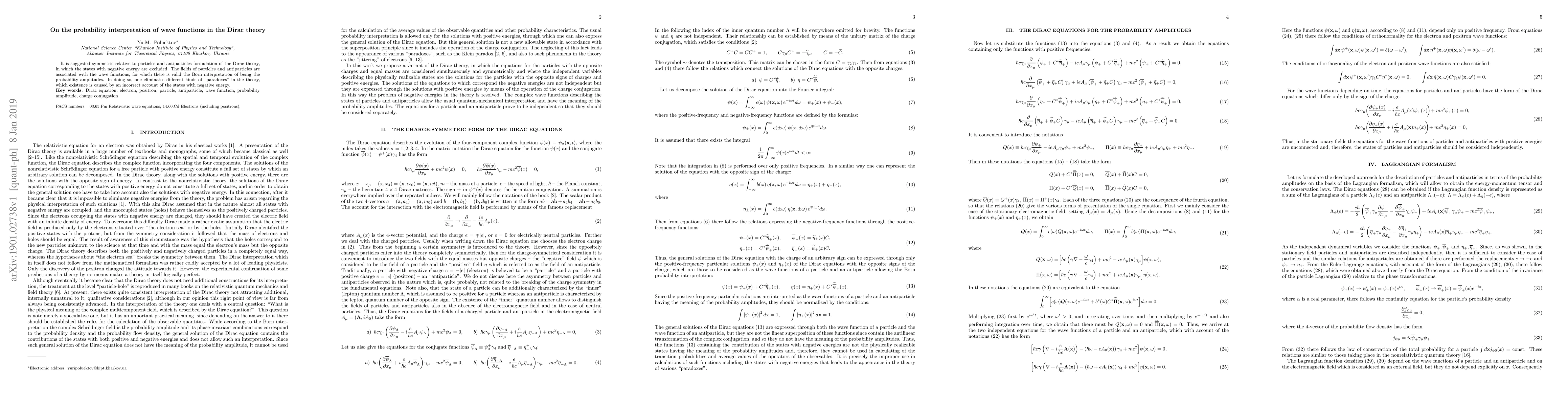 The paper proposes a symmetric formulation of the Dirac theory excluding negative energy states, linking particle and antiparticle fields to probability amplitudes, thereby resolving paradoxes arising from negative energy states. This interpretation aligns with the Born rule for probability amplitudes.