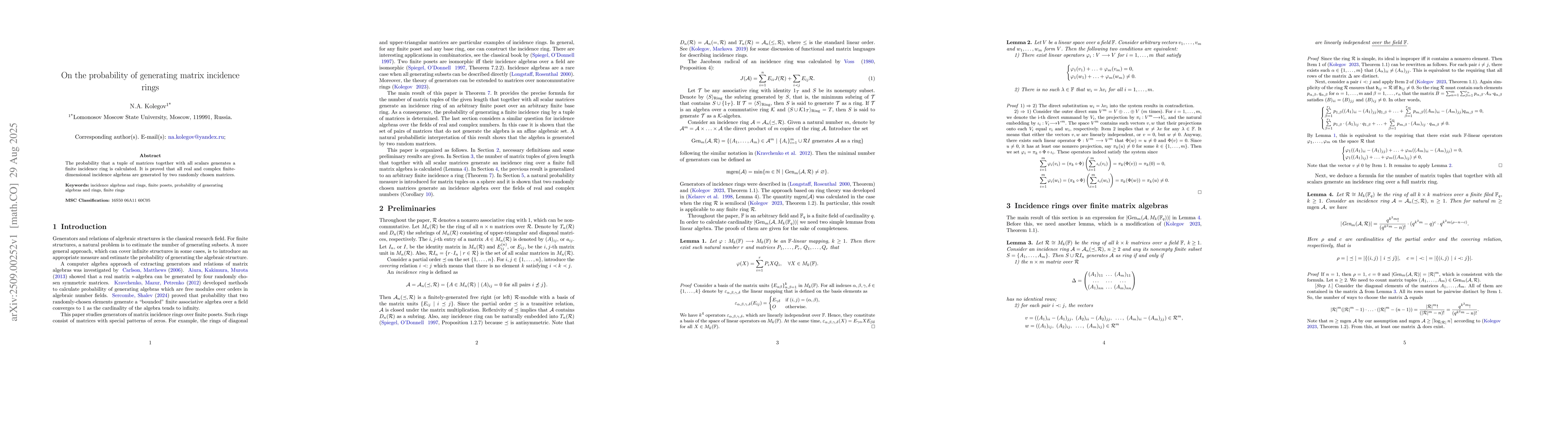 The probability that a tuple of matrices together with all scalars generates a finite incidence ring is calculated. It is proved that all real and complex finite-dimensional incidence algebras are generated by two randomly chosen matrices.