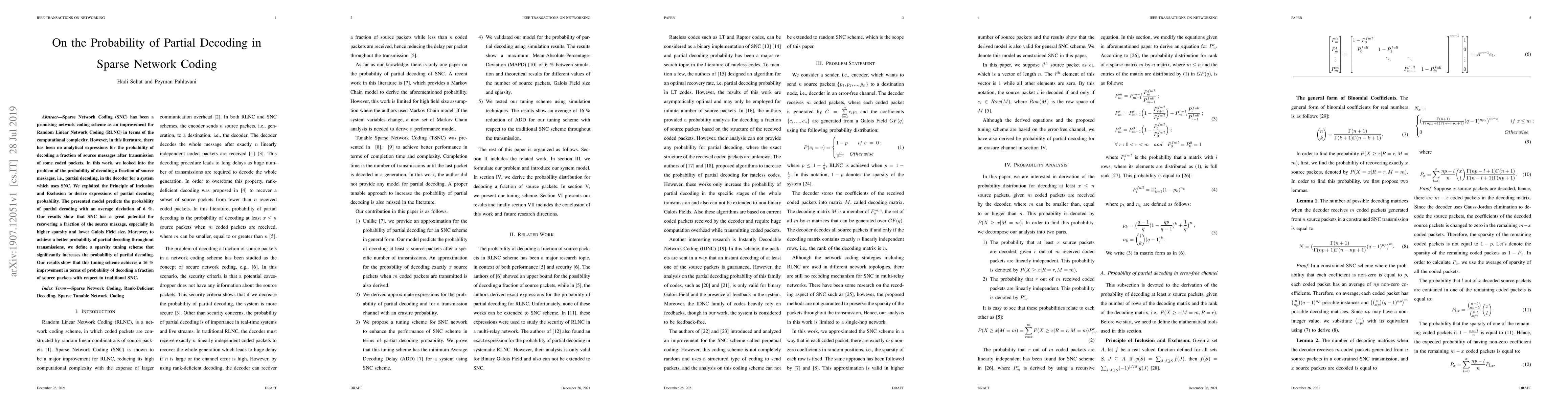 This paper investigates the probability of partial decoding in Sparse Network Coding (SNC), deriving analytical expressions using the Principle of Inclusion and Exclusion. It demonstrates that SNC can recover a fraction of source messages effectively, especially with higher sparsity and lower Galois Field size, and introduces a sparsity tuning scheme that improves partial decoding probability by 16%.