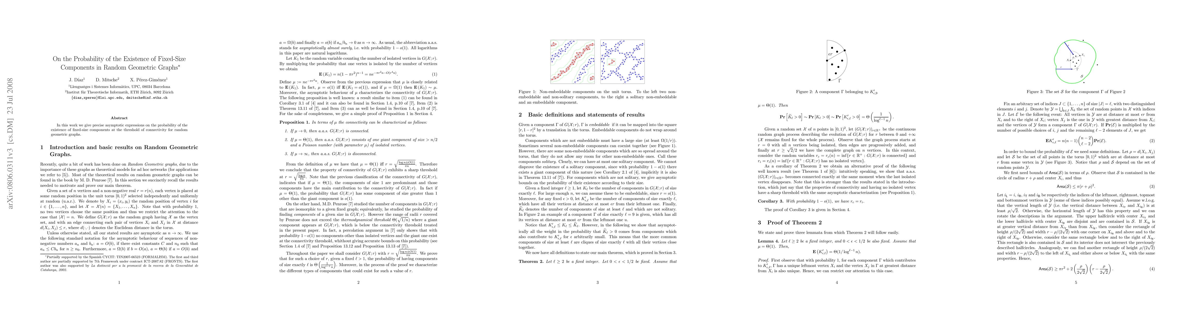 In this work we give precise asymptotic expressions on the probability of the existence of fixed-size components at the threshold of connectivity for random geometric graphs.