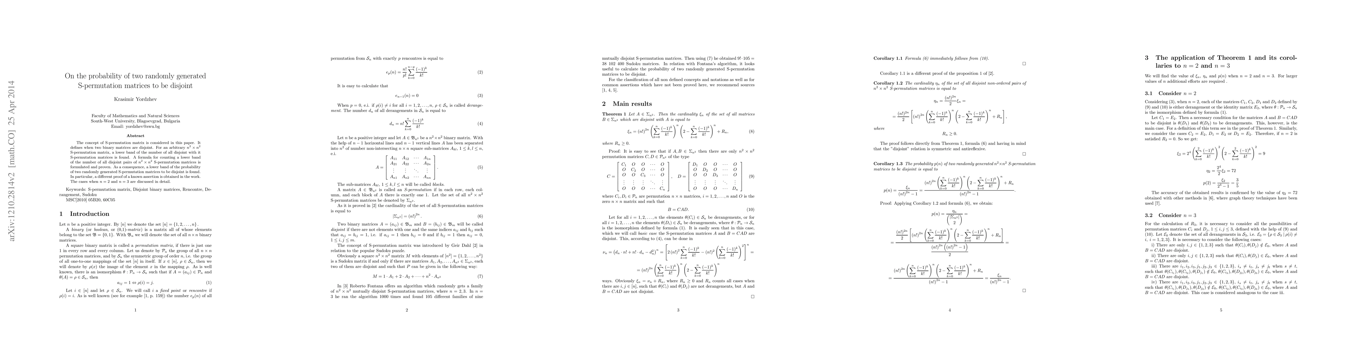 This paper investigates the probability of two randomly generated S-permutation matrices being disjoint, formulating a lower bound for the number of disjoint pairs and deriving a new proof for the probability. Detailed cases for $n=2$ and $n=3$ are examined.