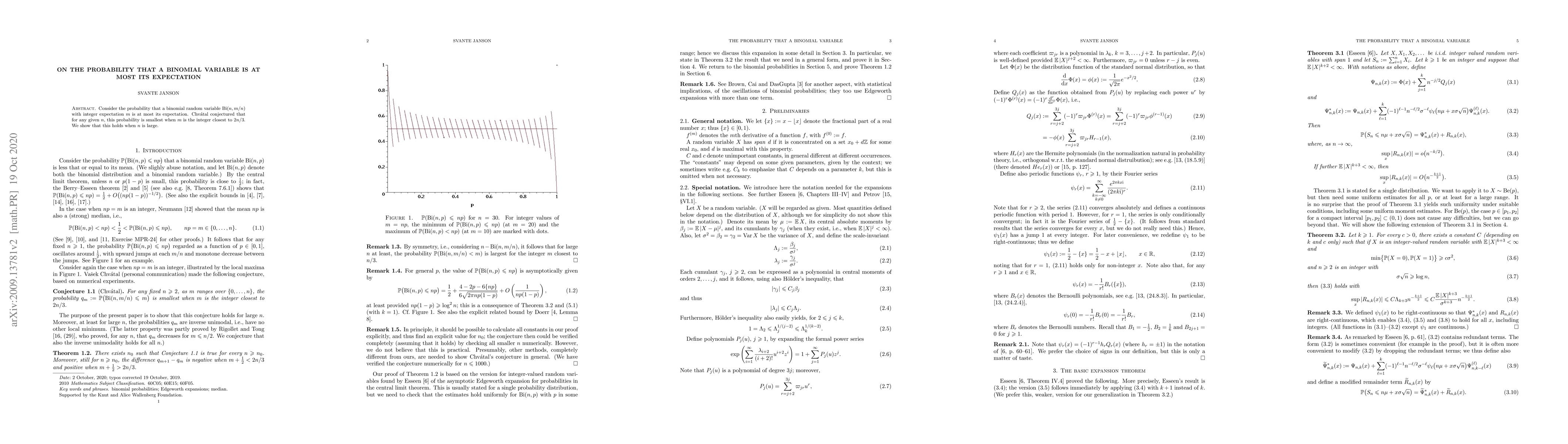 This research proves Chvatal's conjecture for large integers 'n': the probability that a binomial random variable Bi$(n,m/n)$ with integer expectation 'm' is at most its expectation, is minimized when 'm' is the integer closest to '2n/3'.