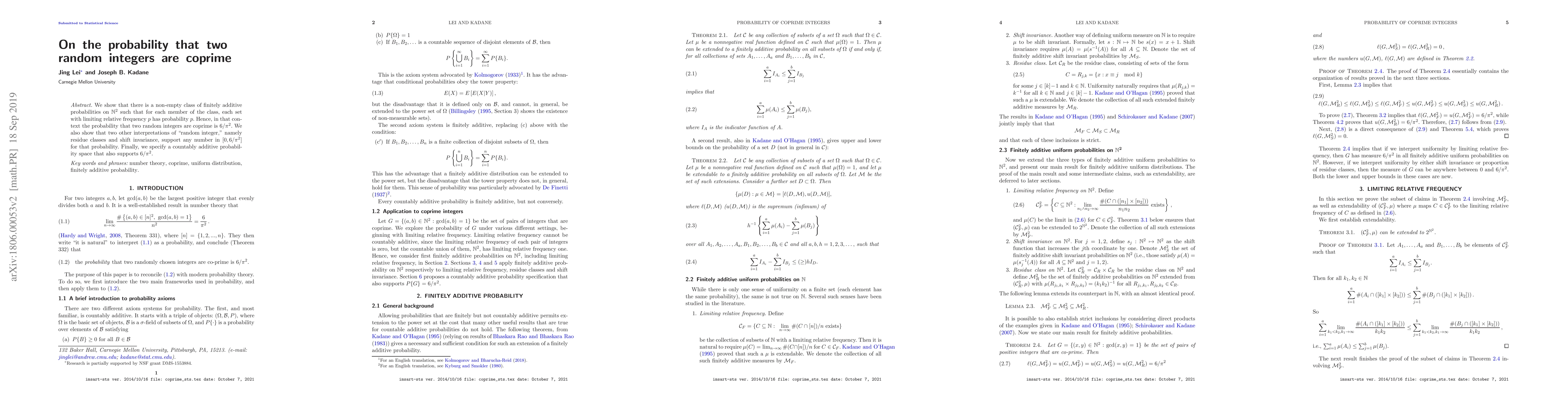 We show that there is a non-empty class of finitely additive probabilities on $\mathbb N^2$ such that for each member of the class, each set with limiting relative frequency $p$ has probability $p$. Hence, in that context the probability that two random integers are coprime is $6/\pi^2$. We also show that two other interpretations of "random integer," namely residue classes and shift invariance, support any number in $[0, 6/\pi^2]$ for that probability. Finally, we specify a countably additive probability space that also supports $6/\pi^2$.