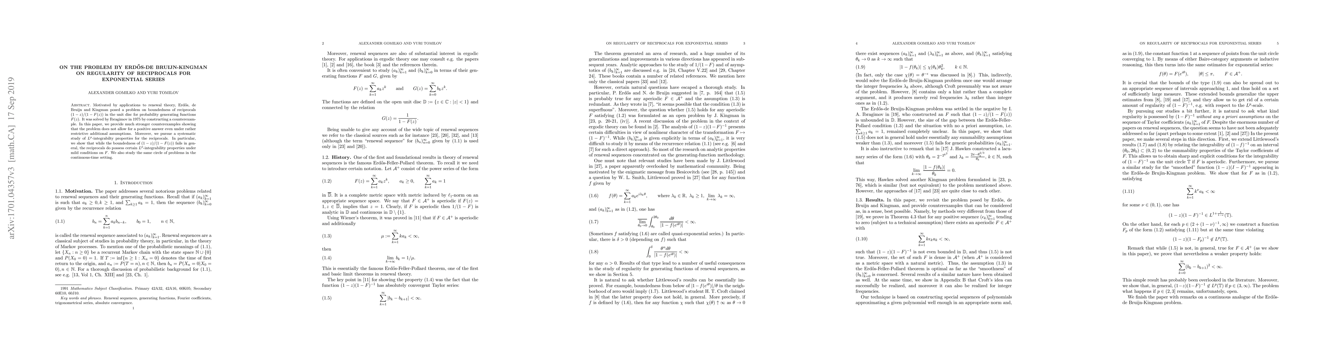 Motivated by applications to renewal theory, Erd\H{o}s, de Bruijn and Kingman posed a problem on boundedness of reciprocals $(1-z)/(1-F(z))$ in the unit disc for probability generating functions $F(z)$. It was solved by Ibragimov in $1975$ by constructing a counterexample. In this paper, we provide much stronger counterexamples showing that the problem does not allow for a positive answer even under rather restrictive additional assumptions. Moreover, we pursue a systematic study of $L^p$-integrabilty properties for the reciprocals. In particular, we show that while the boundedness of $(1-z)/(1-F(z))$ fails in general, the reciprocals do possess certain $L^p$-integrability properties under mild conditions on $F$. We also study the same circle of problems in the continuous-time setting.