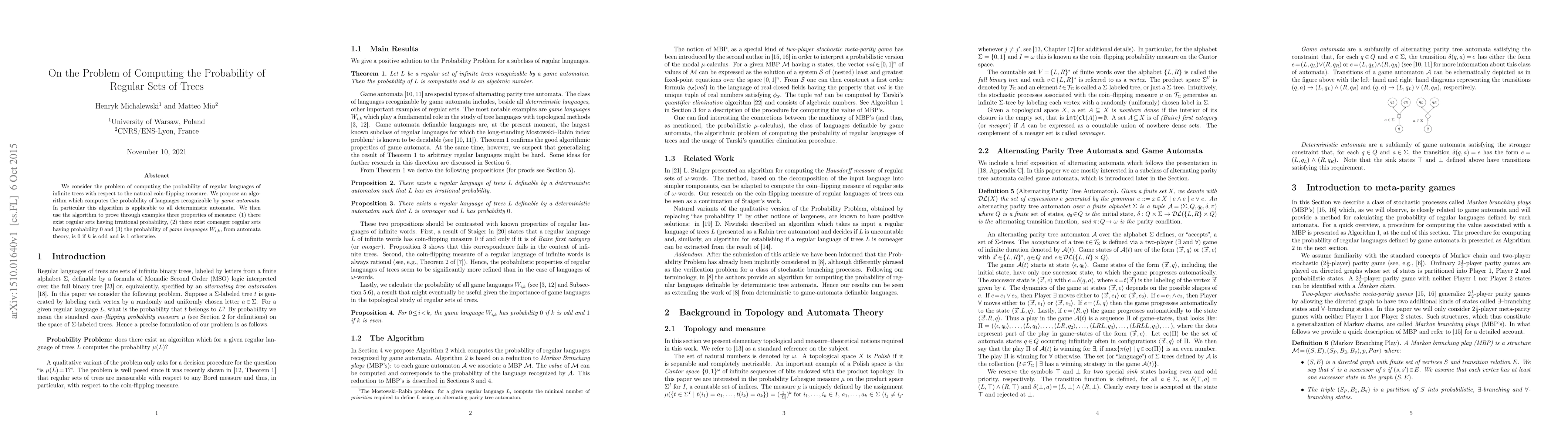 This paper proposes an algorithm for computing the probability of regular languages in infinite trees under a coin-flipping measure. It demonstrates the algorithm's applicability to game automata and deterministic automata, and uses it to prove three properties of measure regarding regular sets.