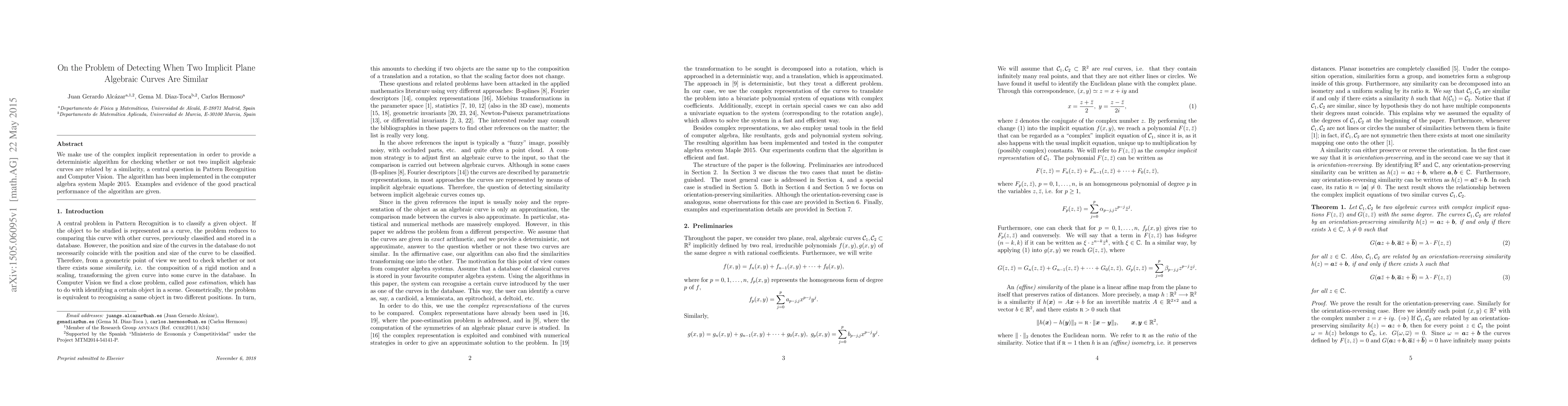 We make use of the complex implicit representation in order to provide a deterministic algorithm for checking whether or not two implicit algebraic curves are related by a similarity, a central question in Pattern Recognition and Computer Vision. The algorithm has been implemented in the computer algebra system Maple 2015. Examples and evidence of the good practical performance of the algorithm are given.