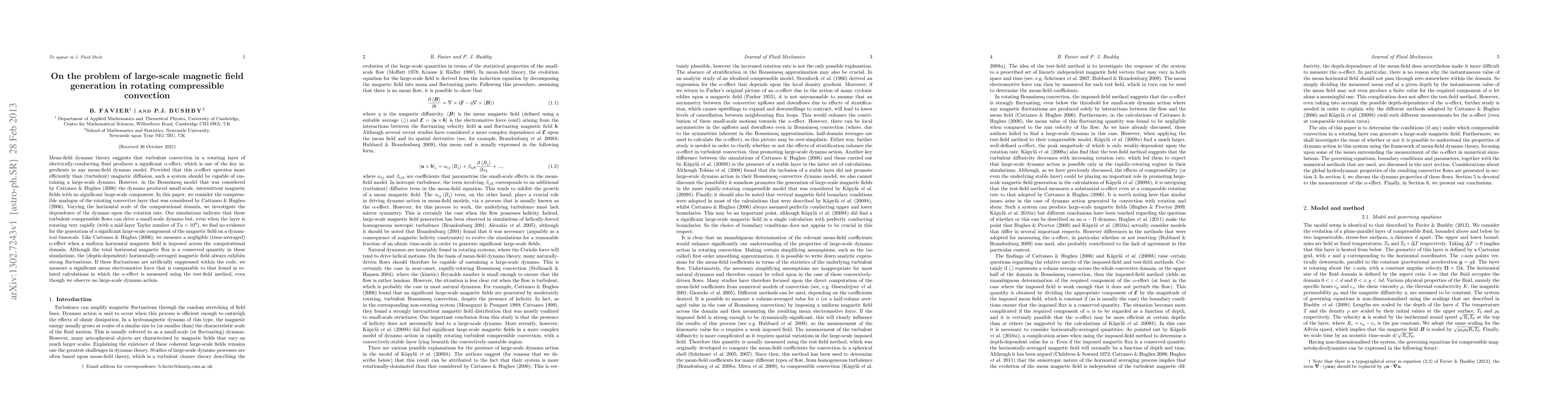 This paper investigates the generation of large-scale magnetic fields in rotating, compressible turbulent convection using simulations. Despite finding evidence of a small-scale dynamo, no significant large-scale magnetic field component is produced, even at high rotation rates, indicating a negligible alpha-effect.