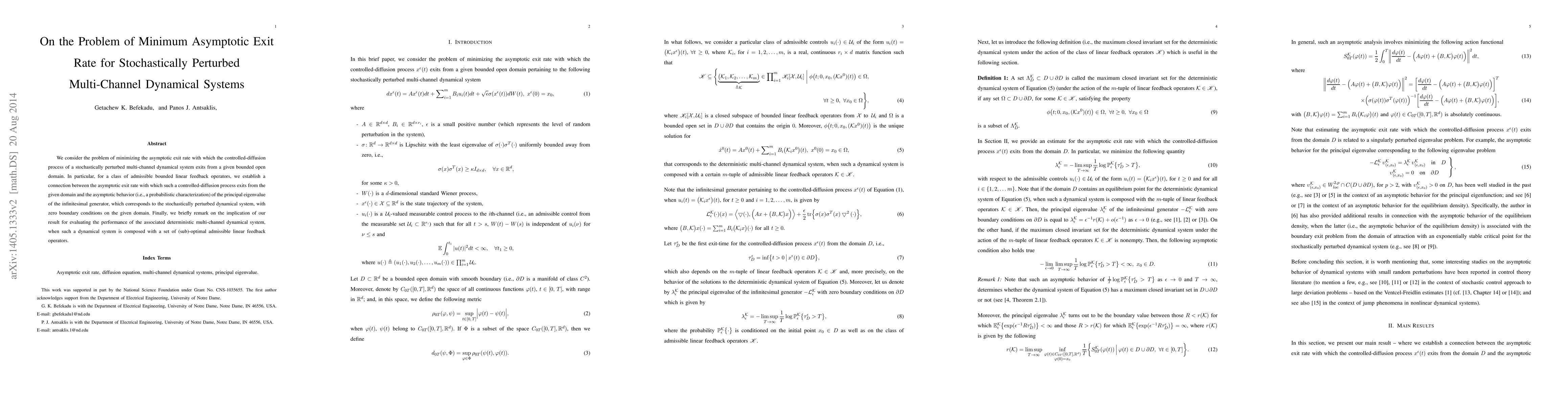 This paper investigates minimizing the asymptotic exit rate of a stochastically perturbed multi-channel dynamical system from a bounded domain, establishing a link between this rate and the principal eigenvalue of the system's infinitesimal generator under zero boundary conditions. The findings have implications for assessing the performance of the deterministic system with optimal feedback operators.