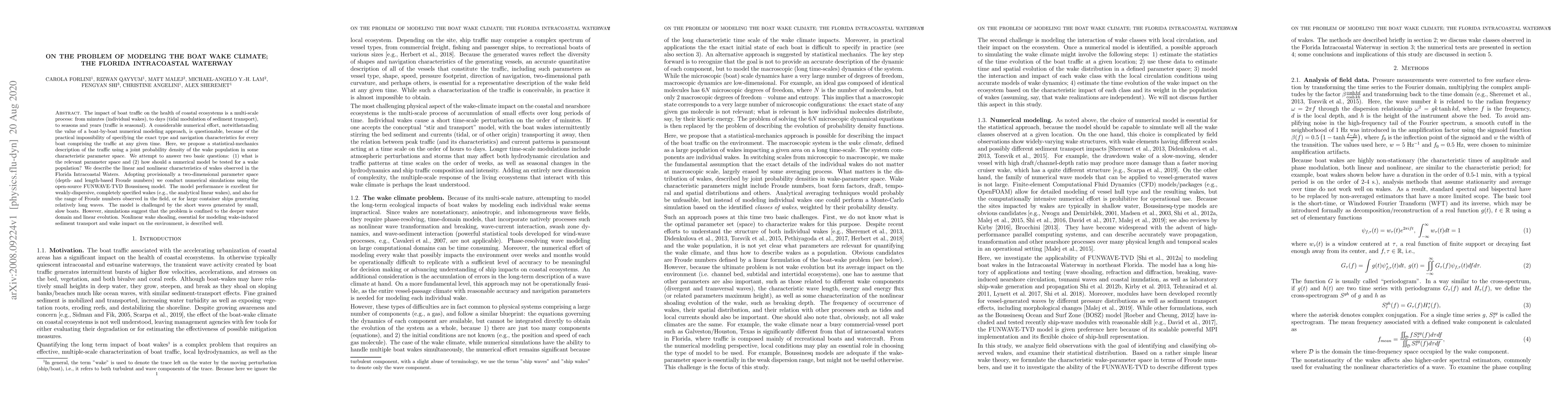 The impact of boat traffic on the health of coastal ecosystems is a multi-scale process: from minutes (individual wakes) to days (tidal modulation of sediment transport), to seasons and years (traffic is seasonal). A considerable numerical effort, notwithstanding the value of a boat-by-boat numerical modeling approach, is questionable, because of the practical impossibility of specifying the exact type and navigation characteristics for every boat comprising the traffic at any given time. Here, we propose a statistical-mechanics description of the traffic using a joint probability density of the wake population in some characteristic parameter space. We attempt to answer two basic questions: (1) what is the relevant parameter space and (2) how should a numerical model be tested for a wake population? We describe the linear and nonlinear characteristics of wakes observed in the Florida Intracoastal Waters. Adopting provisionally a two-dimensional parameter space (depth- and length-based Froude numbers) we conduct numerical simulations using the open-source FUNWAVE-TVD Boussinesq model. The model performance is excellent for weakly-dispersive, completely specified wakes (e.g., the analytical linear wakes), and also for the range of Froude numbers observed in the field, or for large container ships generating relatively long waves. The model is challenged by the short waves generated by small, slow boats. However, simulations suggest that the problem is confined to the deeper water domain and linear evolution. Nonlinear wake shoaling, essential for modeling wake-induced sediment transport and wake impact on the environment, is described well.