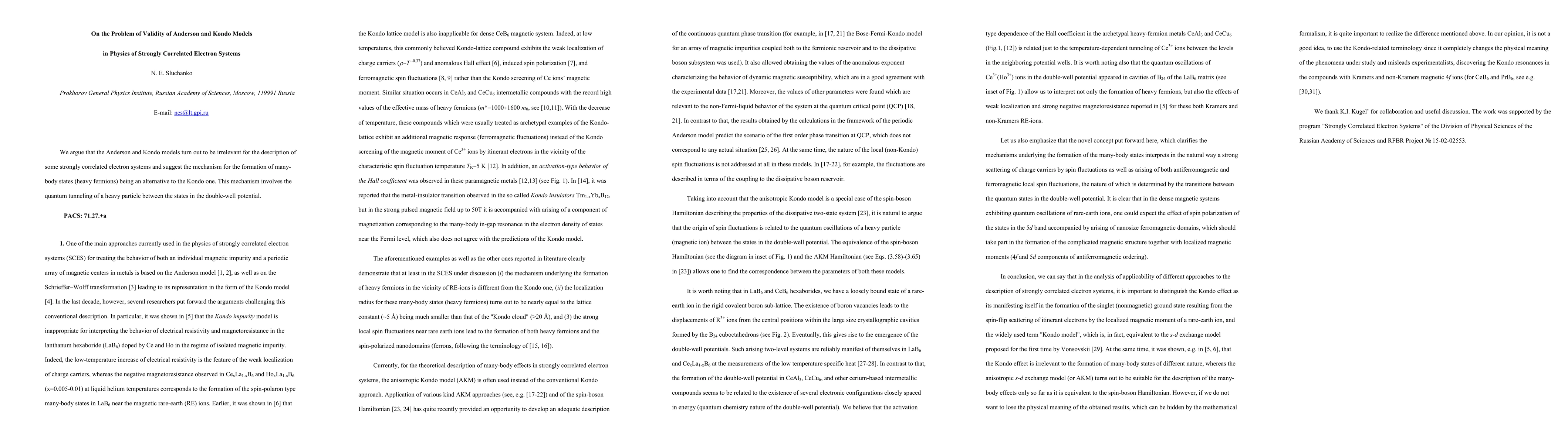 This paper critiques the applicability of Anderson and Kondo models to strongly correlated electron systems, proposing an alternative mechanism involving quantum tunneling of heavy particles in a double-well potential for the formation of many-body states like heavy fermions.