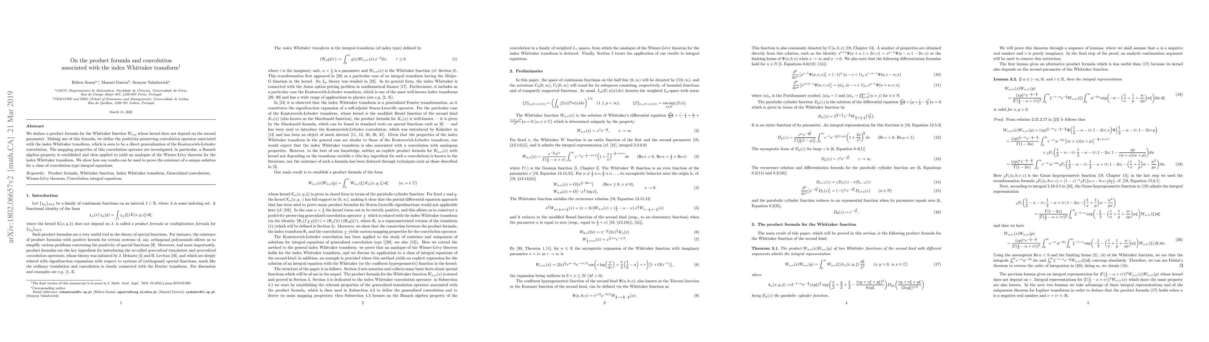 We deduce a product formula for the Whittaker $W$ function whose kernel does not depend on the second parameter. Making use of this formula, we define the positivity-preserving convolution operator associated with the index Whittaker transform, which is seen to be a direct generalization of the Kontorovich-Lebedev convolution. The mapping properties of this convolution operator are investigated; in particular, a Banach algebra property is established and then applied to yield an analogue of the Wiener-L\'evy theorem for the index Whittaker transform. We show how our results can be used to prove the existence of a unique solution for a class of convolution-type integral equations.