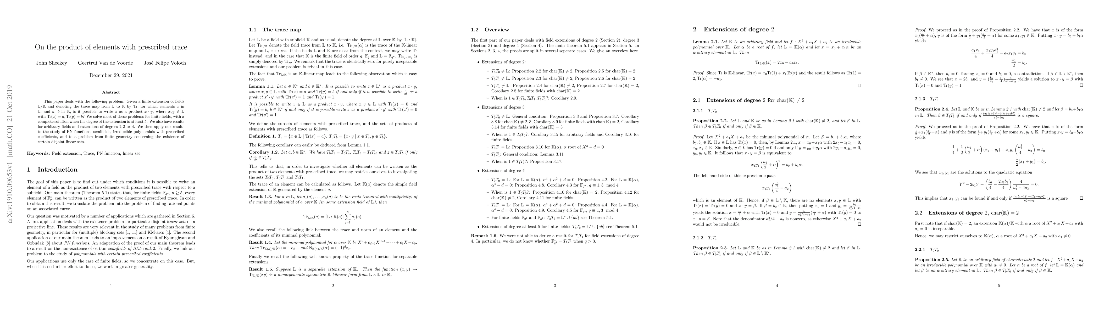 This paper deals with the following problem. Given a finite extension of fields $\mathbb{L}/\mathbb{K}$ and denoting the trace map from $\mathbb{L}$ to $\mathbb{K}$ by $\mathrm{Tr}$, for which elements $z$ in $\mathbb{L}$, and $a$, $b$ in $\mathbb{K}$, is it possible to write $z$ as a product $x\cdot y$, where $x,y\in \mathbb{L}$ with $\mathrm{Tr}(x)=a, \mathrm{Tr}(y)=b$? We solve most of these problems for finite fields, with a complete solution when the degree of the extension is at least $5$. We also have results for arbitrary fields and extensions of degrees $2,3$ or $4$. We then apply our results to the study of PN functions, semifields, irreducible polynomials with prescribed coefficients, and to a problem from finite geometry concerning the existence of certain disjoint linear sets.