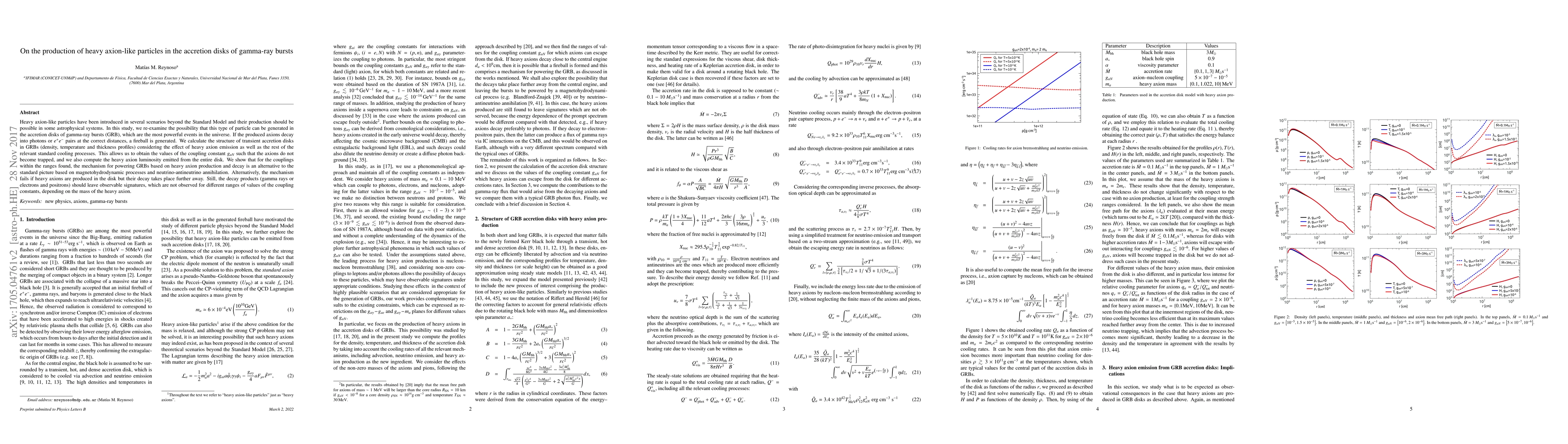 Heavy axion-like particles have been introduced in several scenarios beyond the Standard Model and their production in some astrophysical systems should be possible. In this work, we re-examine the possibility that these type of particles can be generated in the accretion disks of gamma-ray bursts (GRB), the most powerful events in the universe. If the produced axions decay into photons or $e^+e-$ pairs at the correct distances, a fireball is generated. We calculate the structure transient accretion disks in GRBs (density, temperature and thickness profiles) taking into account the effect of heavy axion emission as well as the rest of the relevant standard cooling processes. This allows us to obtain the values of the coupling constant g_{aN} in order for the axions not to become trapped, and we can also compute the emitted heavy axion luminosity from the entire disk. We find that for the couplings within the ranges found, then the mechanism for powering GRBs based on heavy axion production and decay becomes an alternative to the standard picture based upon magnetohydrodynamic processes and neutrino-antineutrino annihilation. Otherwise, if heavy axions are produced in the disk but their decay to takes place further away, the mechanism fails. Still, the decay products (gamma rays or electrons and positrons) should leave observable signatures which are not observed for different ranges of values of the coupling constants, depending on the mass of the heavy axion
