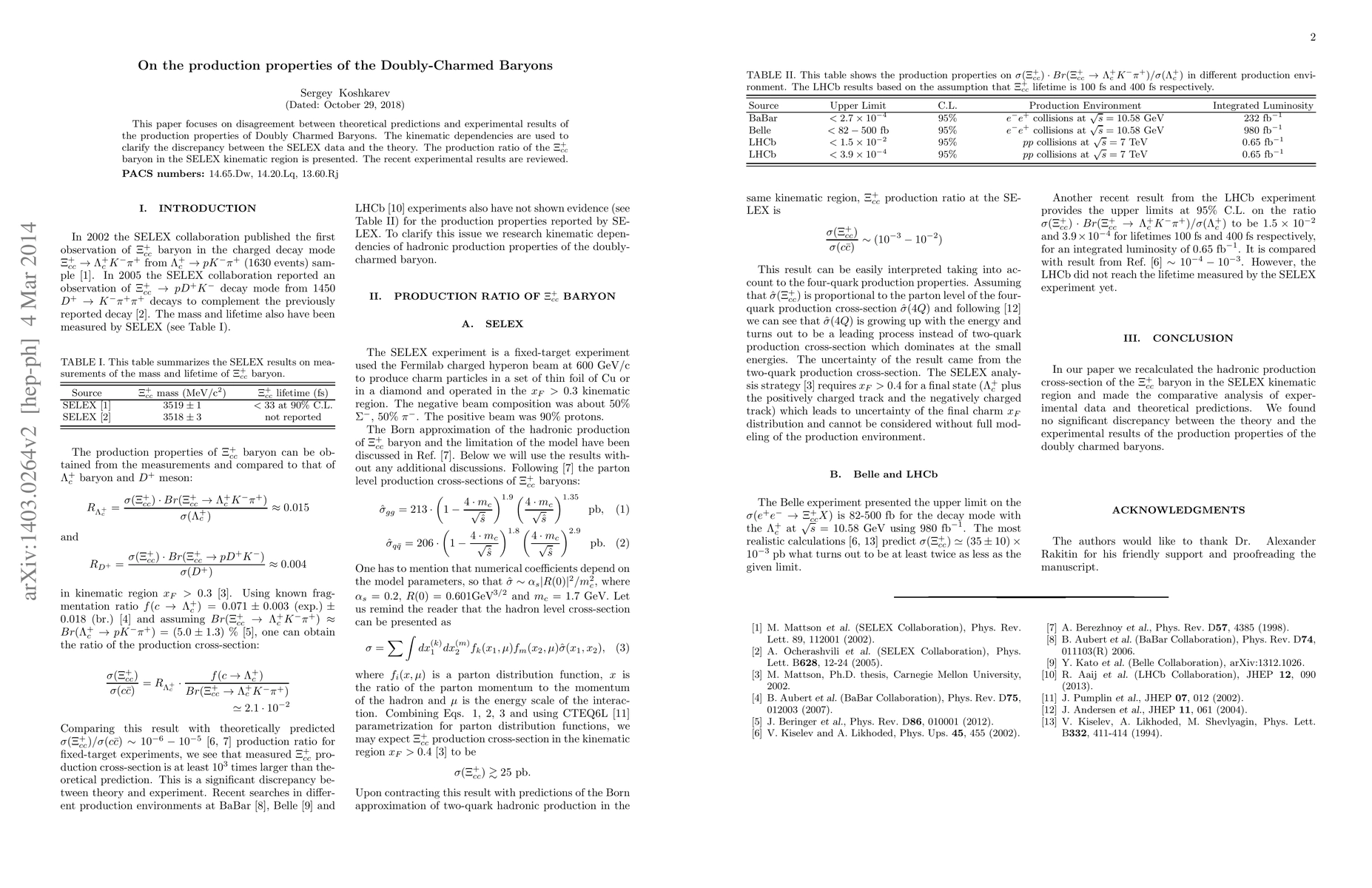 This paper focuses on disagreement between theoretical predictions and experimental results of the production properties of Doubly Charmed Baryons. The kinematic dependencies were used to clarify the discrepancy between the SELEX data and the theory. The production ratio of the $\Xi_{cc}^+$ baryon in the SELEX kinematic region is presented. The recent experimental results are reviewed.