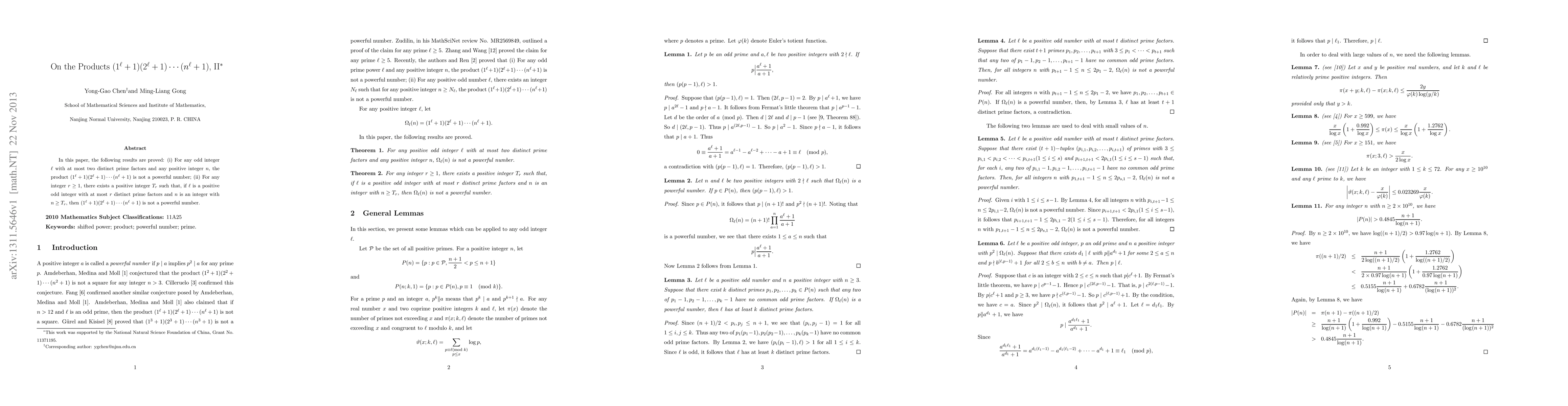 In this paper, the following results are proved: (i) For any odd integer $\ell$ with at most two distinct prime factors and any positive integer $n$, the product $(1^\ell+1)(2^\ell+1)\cdots (n^\ell +1)$ is not a powerful number; (ii) For any integer $r\ge 1$, there exists a positive integer $T_r$ such that, if $\ell$ is a positive odd integer with at most $r$ distinct prime factors and $n$ is an integer with $n\ge T_r$, then $(1^\ell+1)(2^\ell+1)\cdots (n^\ell +1)$ is not a powerful number.