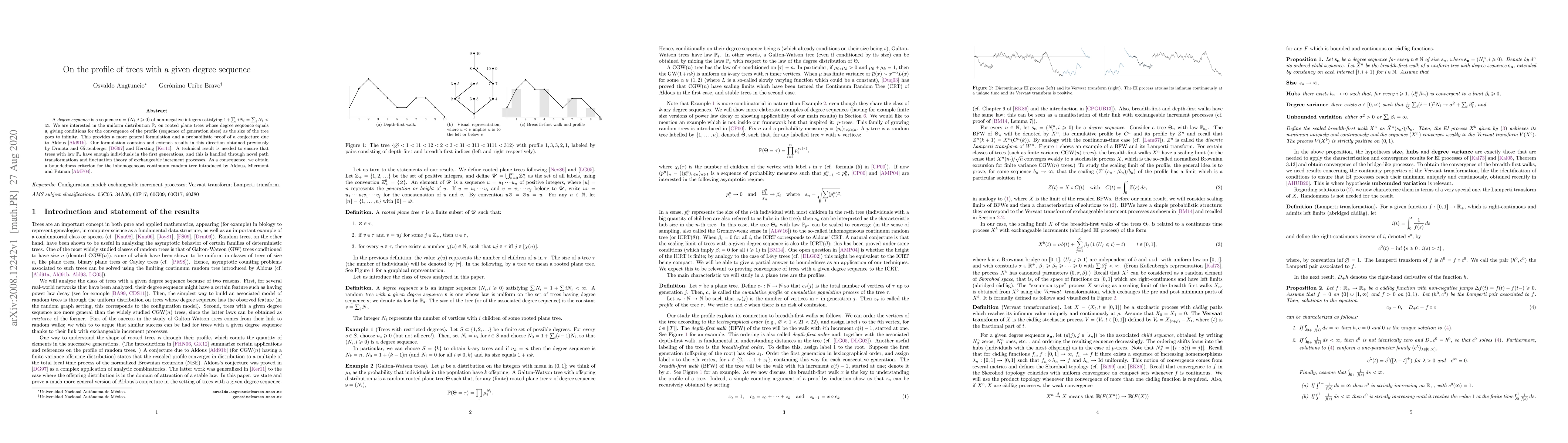 A degree sequence is a sequence ${\bf s}=(N_i,i\geq 0)$ of non-negative integers satisfying $1+\sum_i iN_i=\sum_i N_i<\infty$. We are interested in the uniform distribution $\mathbb{P}_{{\bf s}}$ on rooted plane trees whose degree sequence equals ${\bf s}$, giving conditions for the convergence of the profile (sequence of generation sizes) as the size of the tree goes to infinity. This provides a more general formulation and a probabilistic proof of a conjecture due to Aldous (1991). Our formulation contains and extends results in this direction obtained previously by Drmota and Gittenberger (1997) and Kersting (2011). A technical result is needed to ensure that trees with law $\mathbb{P}_{{\bf s}}$ have enough individuals in the first generations, and this is handled through novel path transformations and fluctuation theory of exchangeable increment processes. As a consequence, we obtain a boundedness criterion for the inhomogeneous continuum random tree introduced by Aldous, Miermont and Pitman (2004).